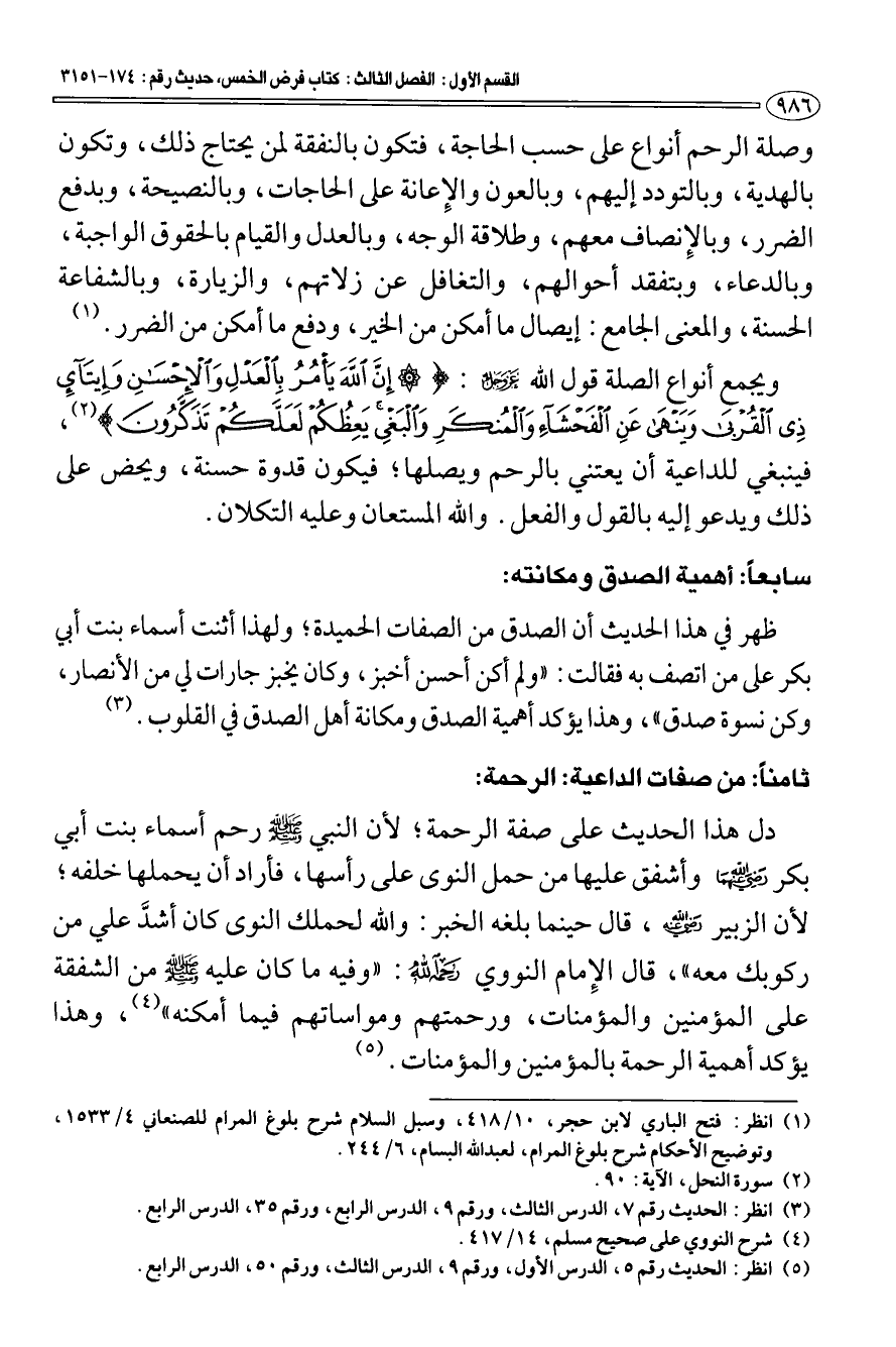 ويجمع أنواع الصلة قول الله عز وجل: {إِنَّ اللَّهَ يَأْمُرُ بِالْعَدْلِ وَالْإِحْسَانِ وَإِيتَاءِ ذِي الْقُرْبَى وَيَنْهَى عَنِ الْفَحْشَاءِ وَالْمُنْكَرِ وَالْبَغْيِ يَعِظُكُمْ لَعَلَّكُمْ تَذَكَّرُونَ} [النحل: 90] (¬2) فينبغي للداعية أن يعتني بالرحم ويصلها؛ فيكون قدوة حسنة، ويحض على ذلك ويدعو إليه بالقول والفعل. والله المستعان وعليه التكلان.