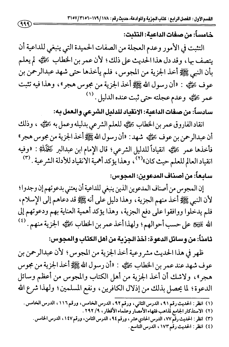 خامسا: من صفات الداعية: التثبت: التثبت في الأمور وعدم العجلة من الصفات الحميدة التي ينبغي للداعية أن يتصف بها، وقد دل هذا الحديث على ذلك؛ لأن عمر بن الخطاب رضي الله عنه لم يعلم بأن النبي صلى الله عليه وسلم أخذ الجزية من المجوس، فلم يأخذها حتى شهد عبد الرحمن بن عوف رضي الله عنه: «أن رسول الله صلى الله عليه وسلم أخذ الجزية من مجوس هجر»، وهذا فيه تثبت عمر رضي الله عنه وعدم عجلته حتى ثبت عنده الدليل (¬1).