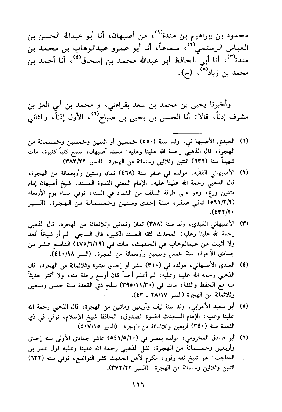 مَحْمُودُ بْنُ إِبْرَاهِيمَ بْنِ مَنْدَهْ مِنْ أَصْبَهَانَ، أنا أَبُو عَبْدِ اللَّهِ الْحَسَنُ بْنُ الْعَبَّاسِ الرُّسْتُمُيُّ سَمَاعًا، أنا أَبُو عَمْرٍو عَبْدُ الْوَهَّابِ بْنُ مُحَمَّدِ بْنِ مَنْدَهْ، أنا أَبِي الْحَافِظُ أَبُو عَبْدِ اللَّهِ مُحَمَّدُ بْنُ إِسْحَاقَ، أنا أَحْمَدُ بْنُ مُحَمَّدِ بْنِ زِيَادٍ ح وَأَخْبَرَنَا يَحْيَى بْنُ مُحَمَّدِ بْنِ سَعْدٍ بِقِرَاءَتِي، وَمُحَمَّدُ بْنُ أَبِي الْعِزِّ بْنِ مُشرفٍ إِذْنًا، قَالا: أنا الْحَسَنُ بْنُ يَحْيَى بْنِ صَبَاحٍ، الأَوَّلُ إِذْنًا، وَالثَّانِي