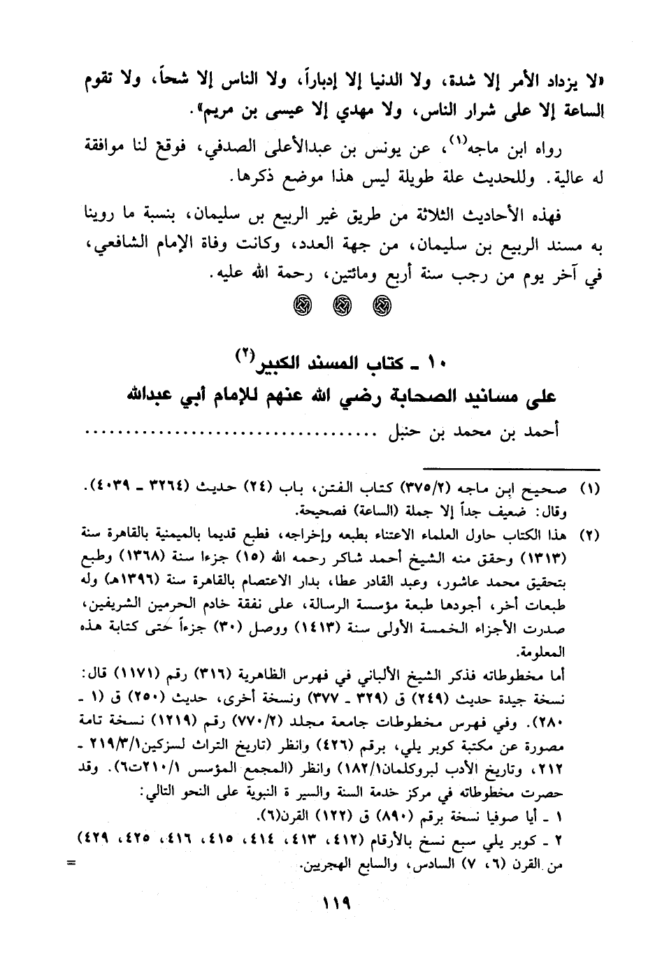 " لا يَزْدَادُ الأَمْرُ إِلا شِدَّةً، وَلا الدُّنْيَا إِلا إِدْبَارًا، وَلا النَّاسُ إِلا شُحًّا، وَلا تَقُومُ السَّاعَةُ إِلا عَلَى شِرَارِ النَّاسِ، وَلا مَهْدِيُّ إِلا عِيسَى ابْنُ مَرْيَمَ " رَوَاهُ ابْنُ مَاجَهْ، عَنْ يُونُسَ بْنِ عَبْدِ الأَعْلَى الصَّدَفِيِّ، فَوَقَعَ لَنَا مُوَافَقَةً لَهُ عَالِيَةً وَلِلْحَدِيثِ عِلَّةٌ طَوِيلَةٌ لَيْسَ هَذَا مَوْضِعَ ذِكْرِهَا فَهَذِهِ الأَحَادِيثُ الثَّلاثَةُ مِنْ طَرِيقٍ غَيْرِ الرَّبِيعِ بْنِ سُلَيْمَانَ، بِنِسْبَةِ مَا رَوَيْنَا بِهِ مُسْنَدَ الرَّبِيعِ بْنِ سُلَيْمَانَ مِنْ جِهَةِ الْعَدَدِ، وَكَانَتْ وَفَاةُ الإِمَامِ الشَّافِعِيِّ فِي آخِرِ يَوْمٍ مِنْ رَجَبٍ سَنَةَ أَرْبَعٍ وَمِائَتَيْنِ رَحْمَةُ اللَّهِ عَلَيْهِ