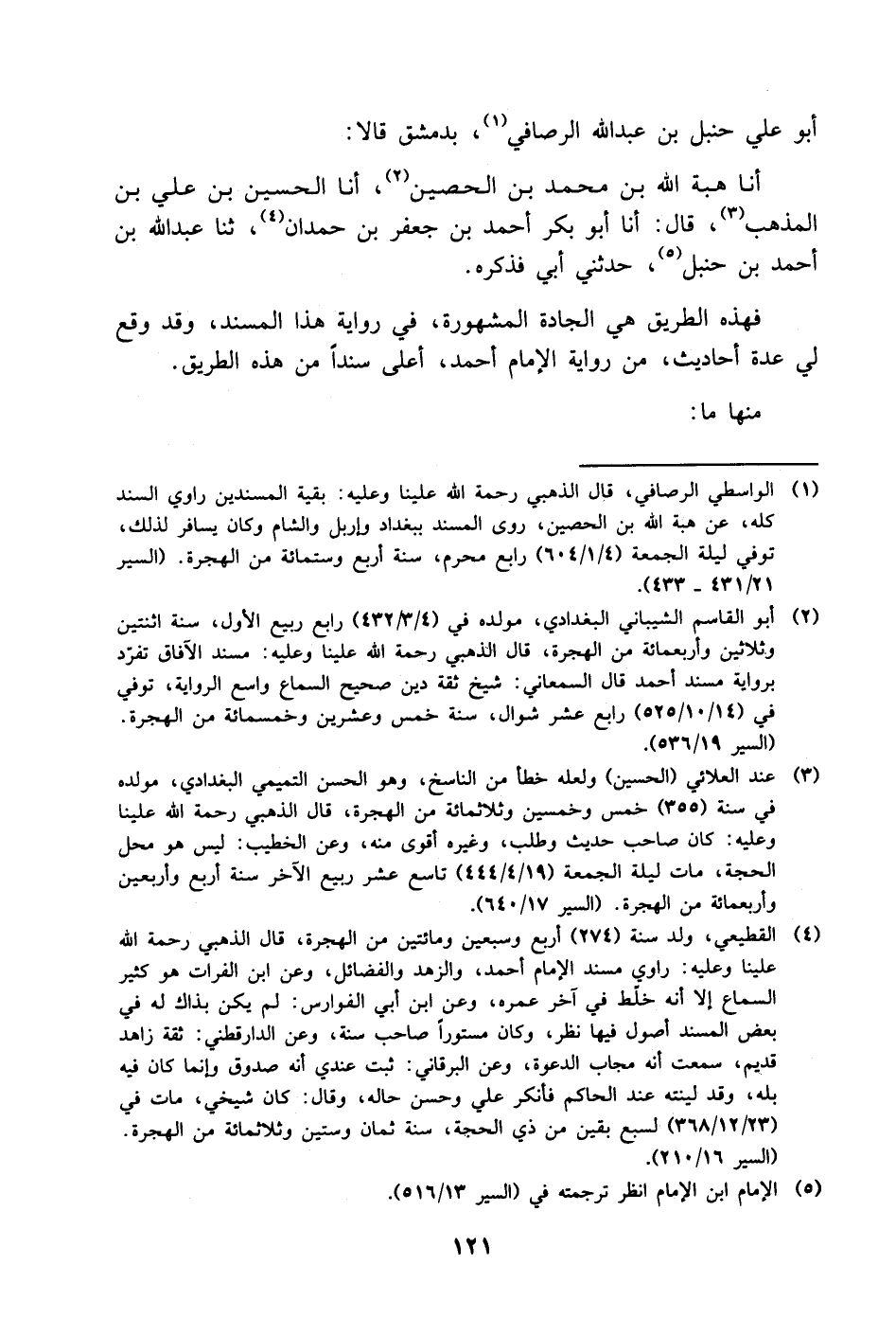 أَبُو عَلِيٍّ حَنْبَلُ بْنُ عَبْدِ اللَّهِ الرُّصَافِيُّ بِدِمَشْقَ، قَالا: أنا هِبَةُ اللَّهِ بْنُ مُحَمَّدِ بْنِ الْحُصَيْنِ، أنا الْحُسَيْنُ بْنُ عَلِيِّ بْنِ الْمُذْهِبِ، قَالَ: أنا أَبُو بَكْرٍ أَحْمَدُ بْنُ جَعْفَرِ بْنِ حَمْدَانَ، ثنا عَبْدُ اللَّهِ بْنُ أَحْمَدَ بْنِ حَنْبَلٍ، حَدَّثَنِي أَبِي فَذَكَرَهُ فَهَذِهِ الطَّرِيقُ هِيَ الْجَادَّةُ الْمَشْهُورَةُ فِي رِوَايَةِ هَذَا الْمُسْنَدِ، وَقَدْ وَقَعَ لِي عِدَّةُ أَحَادِيثَ مِنْ رِوَايَةِ الإِمَامِ أَحْمَدَ أَعْلَى سَنَدًا مِنْ هَذَا الطَّرِيقِ مِنْهَا مَا: