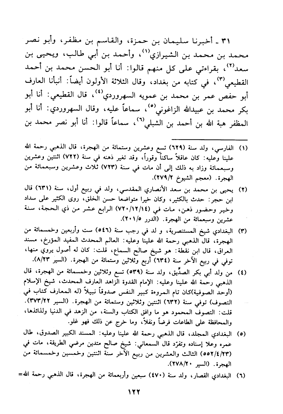 31 - أَخْبَرَنَا سُلَيْمَانُ بْنُ حَمْزَةَ، وَالْقَاسِمُ بْنُ مُظَفَّرٍ، وَأَبُو نَصْرٍ مُحَمَّدُ بْنُ مُحَمَّدِ بْنِ الشِّيرَازِيِّ، وَأَحْمَدُ بْنُ أَبِي طَالِبٍ، وَيَحْيَى بْنُ سَعْدٍ، بِقِرَاءَتِي عَلَى كُلٍّ مِنْهُمْ، قَالُوا: أنا أَبُو الْحَسَنِ مُحَمَّدُ بْنُ أَحْمَدَ الْقَطِيعِيُّ، فِي كِتَابِهِ مِنْ بَغْدَادَ، وَقَالَ الثَّلاثَةُ الأَوَّلُونَ أَيْضًا: أَنْبَأَنَا الْعَارِفُ أَبُو حَفْصٍ عُمَرُ بْنُ مُحَمَّدِ بْنِ عَمُّوَيْهِ السَّهْرَوَرْدِيُّ، قَالَ الْقَطِيعِيُّ: أنا أَبُو بَكْرٍ مُحَمَّدُ بْنُ عُبَيْدِ اللَّهِ الزَّاغُونِيُّ، سَمَاعًا عَلَيْهِ، وَقَالَ السَّهْرَوَرْدِيُّ: أنا أَبُو الْمُظَفَّرِ هِبَةُ اللَّهِ بْنُ أَحْمَدَ بْنِ الشِّبْلِيُّ سَمَاعًا، قَالُوا: أنا أَبُو نَصْرٍ مُحَمَّدُ بْنُ