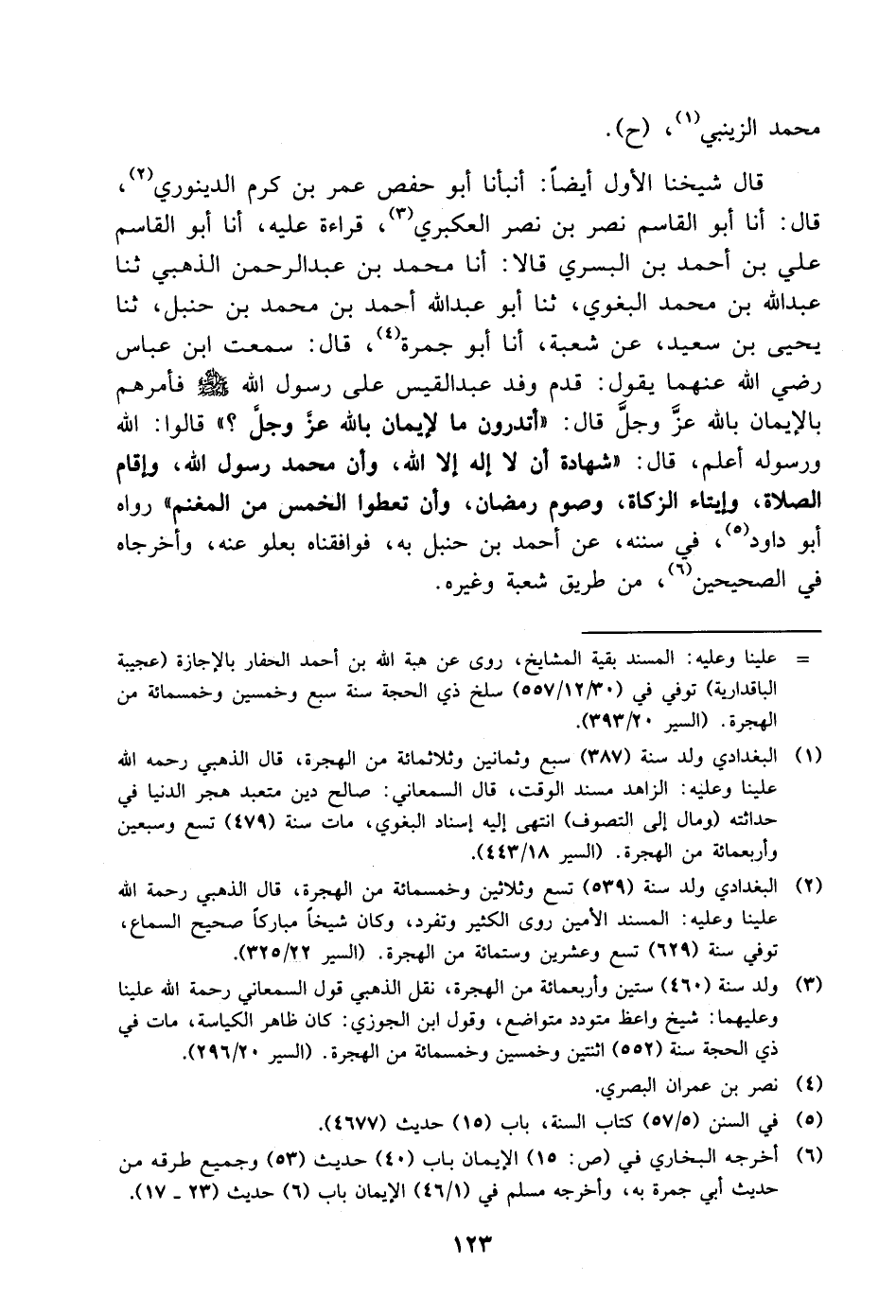 مُحَمَّدٍ الزَّيْنَبِيُّ ح قَالَ شَيْخُنَا الأَوَّلُ أَيْضًا: أَنْبَأَنَا أَبُو حَفْصٍ عُمَرُ بْنُ كَرَمٍ الدِّينَوَرِيُّ، قَالَ: أنا أَبُو الْقَاسِم نصر بْن نصر العكبري قراءة عليه، أنا أَبُو الْقَاسِمِ عَلِيُّ بْنُ أَحْمَدَ بْنِ الْبُسْرِيِّ، قَالا: أنا مُحَمَّدُ بْنُ عَبْدِ الرَّحْمَنِ الذَّهَبِيُّ، ثنا عَبْدُ اللَّهِ بْنُ مُحَمَّدٍ الْبَغَوِيُّ، ثنا أَبُو عَبْدِ اللَّهِ أَحْمَدُ بْنُ مُحَمَّدِ بْنِ حَنْبَلٍ، ثنا يَحْيَى بْنُ سَعِيدٍ، عَنْ شُعْبَةَ، أنا أَبُو جَمْرَةَ، قَالَ: سَمِعْتُ ابْنَ عَبَّاسٍ رَضِيَ اللَّهُ عَنْهُمَا يَقُولُ: قَدِمَ وَفْدُ عَبْدِ الْقَيْسِ عَلَى رَسُولِ اللَّهِ صَلَّى اللَّهُ عَلَيْهِ وَسَلَّمَ فَأَمَرَهُمْ بِالإِيمَانِ بِاللَّهِ عَزَّ وَجَلَّ قَالَ: " أَتَدْرُونَ مَا الإِيمَانُ بِاللَّهِ عَزَّ وَجَلَّ؟ " قَالُوا: اللَّهُ وَرَسُولُهُ أَعْلَمُ، قَالَ: " شَهَادَةُ أَنْ لا إِلَهَ إِلا اللَّهُ وَأَنَّ مُحَمَّدًا رَسُولُ اللَّهِ، وَإِقَامُ الصَّلاةُ، وَإِيتَاءُ الزَّكَاةُ، وَصَوْمُ رَمَضَانَ، وَأَنْ تُعْطُوا الْخُمُسَ مِنَ الْمَغْنَمِ " رَوَاهُ أَبُو دَاوُدَ فِي سُنَنِهِ، عَنْ أَحْمَدَ بْنِ حَنْبَلٍ بِهِ، فَوَافَقْنَاهُ بِعُلُوٍّ عَنْهُ، وَأَخْرَجَاهُ فِي الصَّحِيحَيْنِ مِنْ طَرِيقِ شُعْبَةَ وَغَيْرِهِ.