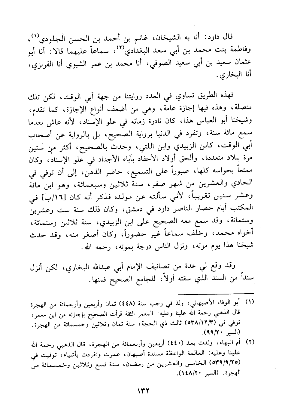 قَالَ دَاوُدُ: أنا بِهِ الشَّيْخَانِ غَانِمُ بْنُ أَحْمَدَ بْنِ الْحَسَنِ الْجُلُودِيُّ، وَفَاطِمَةُ بِنْتُ مُحَمَّدِ بْنِ أَبِي سَعْدٍ الْبَغْدَادِيِّ، سَمَاعًا عَلَيْهِمَا، قَالا: أنا أَبُو عُثْمَانَ سَعِيدُ بْنُ أَبِي سَعِيدٍ الصُّوفِيُّ، أنا مُحَمَّدُ بْنُ عُمَرَ الشَّبُّوِيُّ، أنا الْفَرَبْرِيُّ، أنا الْبُخَارِيُّ فَهَذِهِ الطَّرِيقُ تُسَاوِي فِي الْعَدَدِ رِوَايَتَنَا مِنْ جِهَةِ أَبِي الْوَقْتِ، لَكِنْ تِلْكَ مُتَّصِلَةٌ وَهَذِهِ فِيهَا إِجَازَةٌ عَامَّةٌ، وَهِيَ مِنْ أَضْعَفِ أَنْوَاعِ الإِجَازَةِ كَمَا تَقَدَّمَ، وَشَيْخُنَا أَبُو الْعَبَّاسِ هَذَا كَانَ نَادِرَةَ زَمَانِهِ فِي عُلُوِّ الإِسْنَادِ، لأَنَّهُ عَاشَ بَعْدَ مَا سَمِعَ مِائَةَ سَنَةٍ، وَتَفَرَّدَ فِي الدُّنْيَا بِرِوَايَةِ الصَّحِيحِ بَلْ بِالرِّوَايَةِ عَنْ أَصْحَابِ أَبِي الْوَقْتِ، كَابْنِ الزُّبَيْدِيِّ وَابْنِ اللَّتِّيِّ، وَحَدَّثَ بِالصَّحِيحِ أَكْثَرَ مِنْ سِتِّينَ مَرَّةً بِبِلادٍ مُتَعَدِّدَةٍ، وَأَلْحَقَ أَوْلادَ الأَحْفَادِ بِآبَاءِ الأَجْدَادِ فِي عُلُوِّ الإِسْنَادِ، وَكَانَ مُمَتَّعًا بِحَوَاسِّهِ كُلِّهَا، صَبُورًا عَلَى التَّسْمِيعِ حَاضِرَ الذِّهْنِ، إِلَى