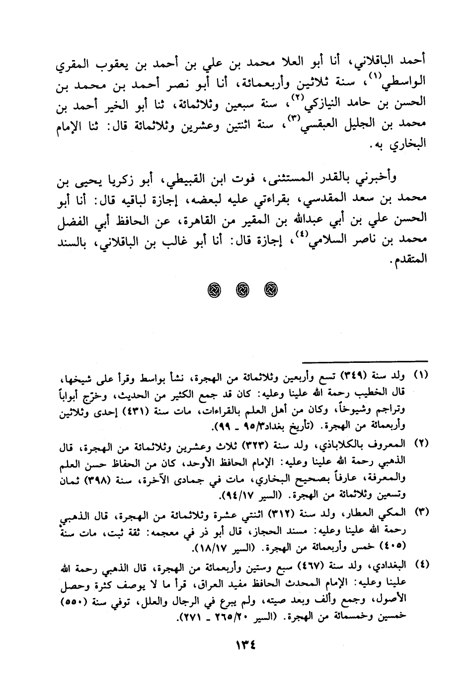 أَحْمَدَ الْبَاقِلانِيُّ، أنا أَبُو الْعلا مُحَمَّدُ بْنُ عَلِيِّ بْنِ أَحْمَدَ بْنِ يَعْقُوبَ الْمُقْرِئُ الْوَاسِطِيُّ سَنَةَ ثَلاثِينَ وَأَرْبَعِ مِائَةٍ، أنا أَبُو نَصْرٍ أَحْمَدُ بْنُ مُحَمَّدِ بْنِ الْحَسَنِ بْنِ حَامِدٍ النِّيَازَكِيُّ، سَنَةَ سَبْعِينَ وَثَلاثِ مِائَةٍ، ثنا أَبُو الْخَيْرِ أَحْمَدُ بْنُ مُحَمَّدِ بْنِ الْجَلِيلِ الْعَبْقَسِيُّ سَنَةَ اثْنَتَيْنِ وَعِشْرِينَ وَثَلاثِ مِائَةٍ، قَالَ: ثنا الإِمَامُ الْبُخَارِيُّ بِهِ وَأَخْبَرَنِي بِالْقَدْرِ الْمُسْتَثْنَى فَوْتًا ابْنُ الْقُبَّيْطِيِّ أَبُو زَكَرِيَّا يَحْيَى بْنُ مُحَمَّدِ بْنِ سَعْدٍ الْمَقْدِسِيُّ بِقِرَاءَتِي عَلَيْهِ لِبَعْضِهِ، إِجَازَةً لِبَاقِيهِ، قَالَ: أنا أَبُو الْحَسَنِ عَلِيُّ بْنُ أَبِي عَبْدِ اللَّهِ بْنِ الْمُقَيَّرِ مِنَ الْقَاهِرَةِ، عَنِ الْحَافِظِ أَبِي الْفَضْلِ مُحَمَّدِ بْنِ