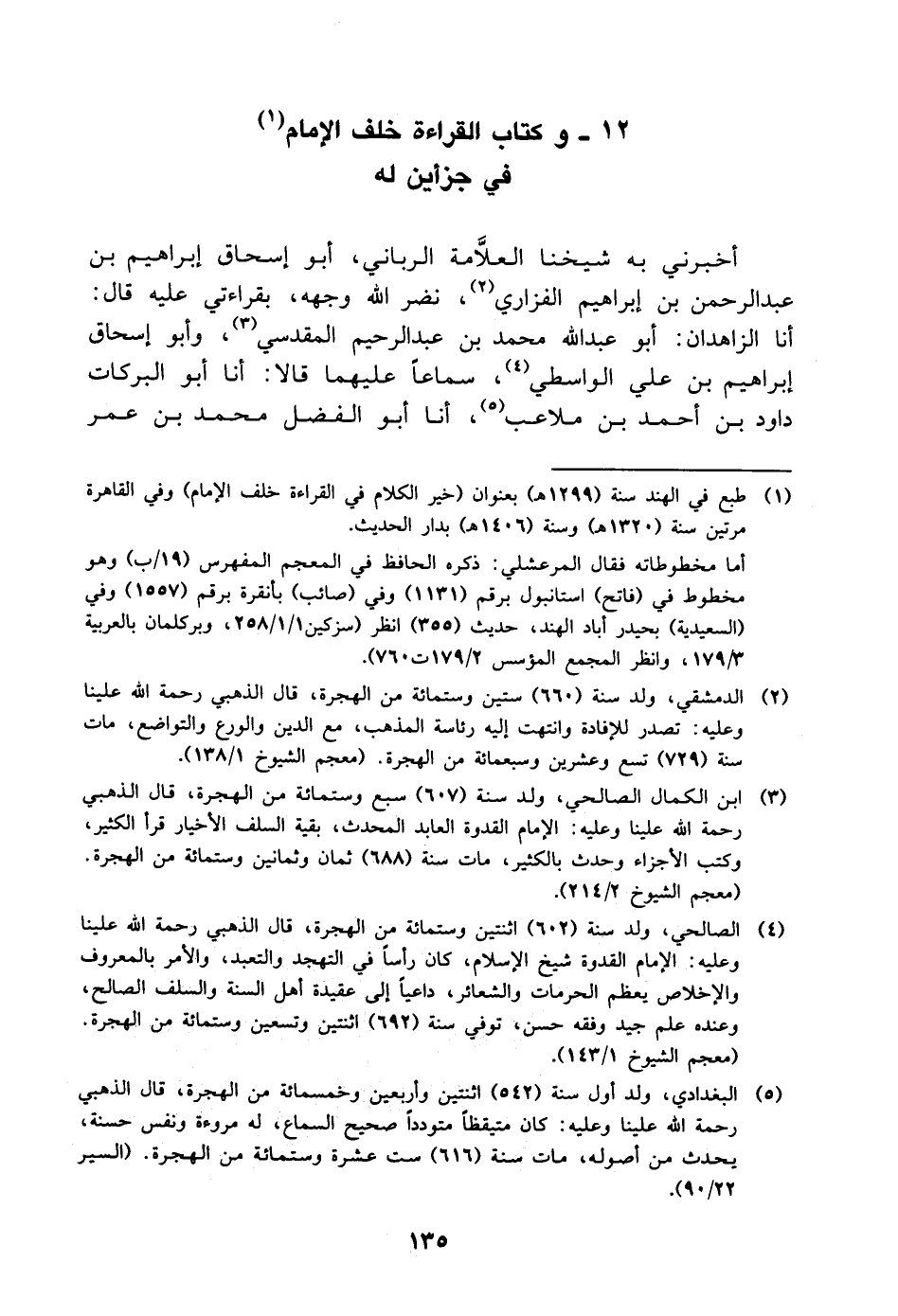 وَكِتَابُ الْقِرَاءَةِ خَلْفَ الإِمَامِ