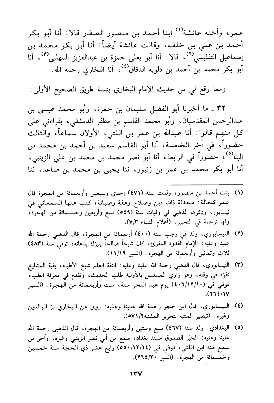 عُمَرُ، وَأُخْتُهُ عَائِشَةُ ابْنَا أَحْمَدَ بْنِ مَنْصُورٍ الصَّفَّارِ قالا: أنا أَبُو بَكْرٍ أَحْمَدُ بْنُ عَلِيِّ بْنِ خَلَفٍ، وَقَالَتْ عَائِشَةُ أَيْضًا: أنا أَبُو بَكْرٍ مُحَمَّدُ بْنُ إِسْمَاعِيلَ التَّفْلِيسِيُّ، قَالا: أنا أَبُو يَعْلَى حَمْزَةُ بْنُ عَبْدِ الْعَزِيزِ الْمُهَلَّبِيُّ، أنا أَبُو بَكْرٍ مُحَمَّدُ بْنُ أَحْمَدَ بْنِ دَلُّوَيْهِ الدَّقَّاقُ، أنا الْبُخَارِيُّ رَحِمَهُ اللَّهُ وَمِمَّا وَقَعَ لِي مِنْ حَدِيثِ الإِمَامِ الْبُخَارِيِّ بِنِسْبَةِ طَرِيقِ الصَّحِيحِ الأُولَى: