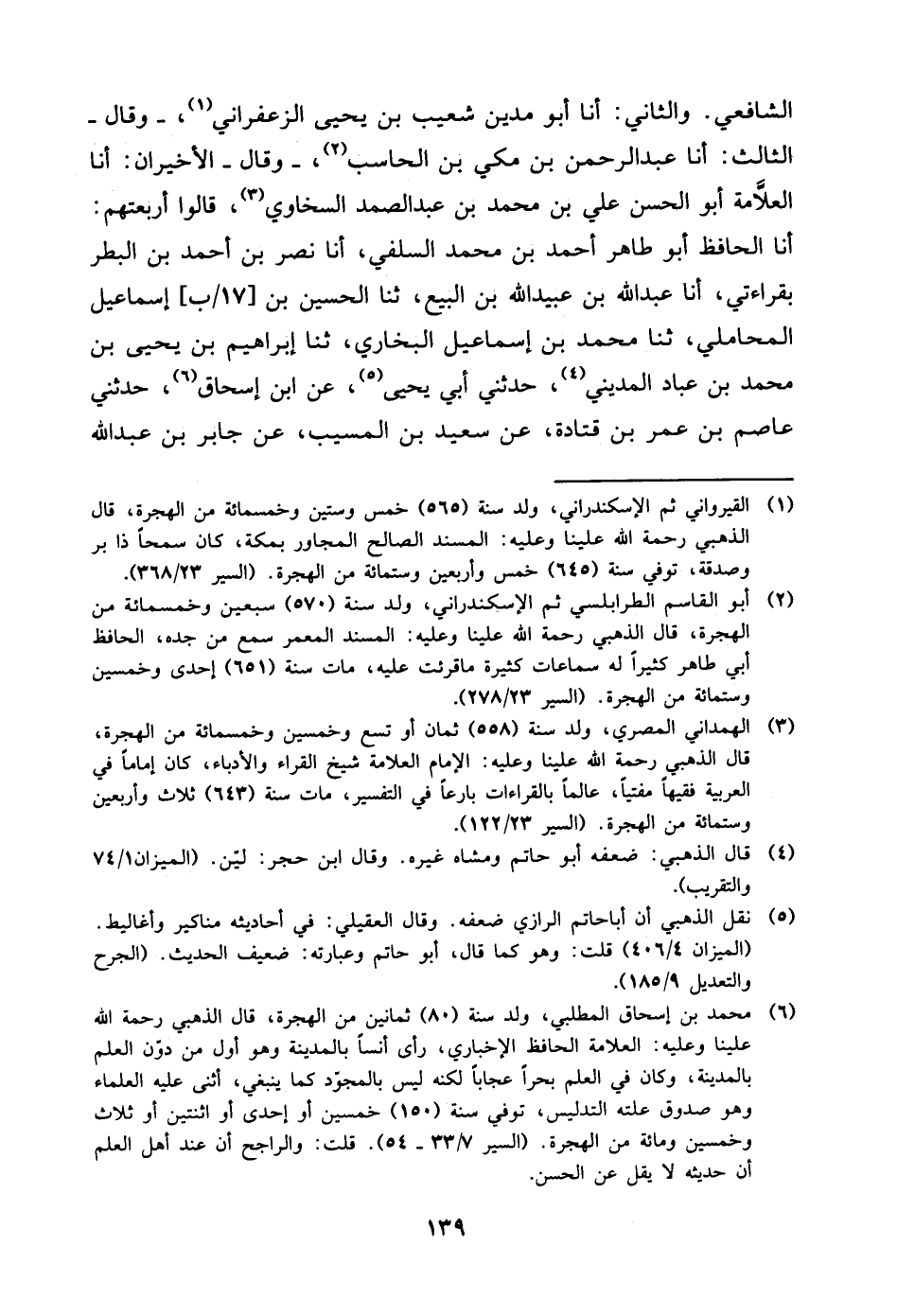 الشَّافِعِيُّ، وَالثَّانِي: أنا أَبُو مدين شُعَيْبُ بْنُ يَحْيَى الزَّعْفَرَانِيُّ، وَقَالَ الثَّالِثُ: أنا عَبْدُ الرَّحْمَنِ بْنُ مَكِّيِّ بْنِ الْحَاسِبِ، وَقَالَ الأَخِيرَانِ: أنا الْعَلامَةُ أَبُو الْحَسَنِ عَلِيُّ بْنُ مُحَمَّدِ بْنِ عَبْدِ الصَّمَدِ السّخَاوِيُّ، قَالُوا أَرْبَعَتُهُمْ: أنا الْحَافِظُ أَبُو طَاهِرٍ أَحْمَدُ بْنُ مُحَمَّدٍ السِّلَفِيُّ، أنا نَصْرُ بْنُ أَحْمَدَ بْنِ الْبَطِرِ بِقِرَاءَتِي، أنا عَبْدُ اللَّهِ بْنُ عُبَيْدِ اللَّهِ بْنِ الْبَيِّعِ، ثنا الْحُسَيْنُ بْنُ إِسْمَاعِيلَ الْمَحَامِلِيُّ، ثنا مُحَمَّدُ بْنُ إِسْمَاعِيلَ الْبُخَارِيُّ، ثنا إِبْرَاهِيمُ بْنُ يَحْيَى بْنِ مُحَمَّدِ بْنِ عَبَّادٍ الْمَدِينِيُّ، حَدَّثَنِي أَبِي يَحْيَى، عَنْ أَبِي إِسْحَاقَ، حَدَّثَنِي عَاصِمُ بْنُ عُمَرَ بْنِ قَتَادَةَ، عَنْ سَعِيدِ بْنِ الْمُسَيِّبِ، عَنْ جَابِرِ بْنِ عَبْدِ اللَّهِ