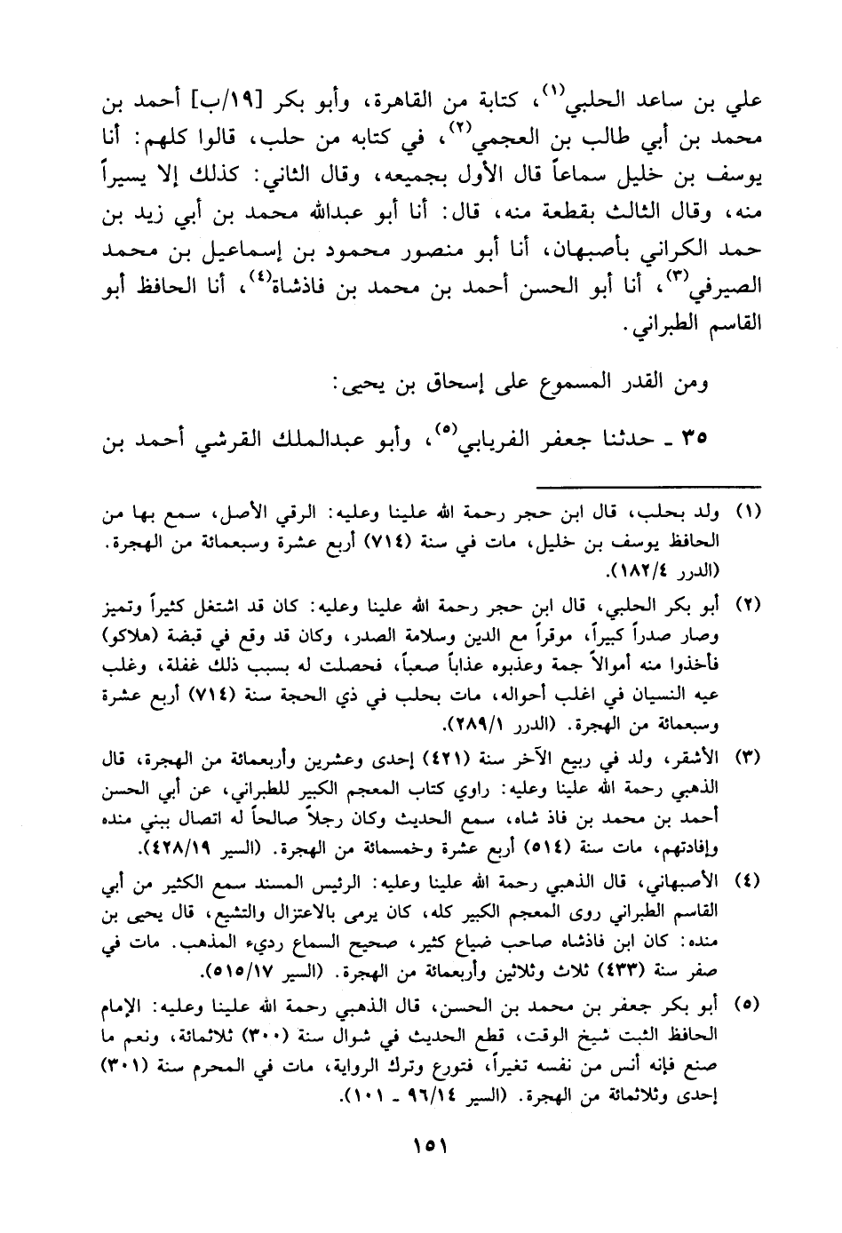 عَلِيِّ بْنِ سَاعِدٍ الْحَلَبِيُّ كِتَابَةً مِنَ الْقَاهِرَةِ، وَأَبُو بَكْرٍ أَحْمَدُ بْنُ مُحَمَّدِ بْنِ أَبِي طَالِبِ بْنِ الْعَجَمِيِّ، فِي كِتَابِهِ مِنْ حَلَبَ، قَالُوا كُلُّهُمْ: أنا يُوسُفُ بْنُ خَلِيلٍ سَمَاعًا قَالَ الأَوَّلُ بِجَمِيعِهِ، وَقَالَ الثَّانِي: كَذَلِكَ إِلا يَسِيرًا مِنْهُ، وَقَالَ الثَّالِثُ بِقِطْعَةٍ مِنْهُ، قَالَ: أنا أَبُو عَبْدِ اللَّهِ مُحَمَّدُ بْنُ أَبِي زَيْدِ بْنِ حَمْدٍ الْكَرَّانِيُّ بِأَصْبَهَانَ، أنا أَبُو مَنْصُورٍ مَحْمُودُ بْنُ إِسْمَاعِيلَ بْنِ مُحَمَّدٍ الصَّيْرَفِيُّ، أنا أَبُو الْحَسَنِ أَحْمَدُ بْنُ مُحَمَّدِ بْنِ فَاذْشَاهْ، أنا الْحَافِظُ أَبُو