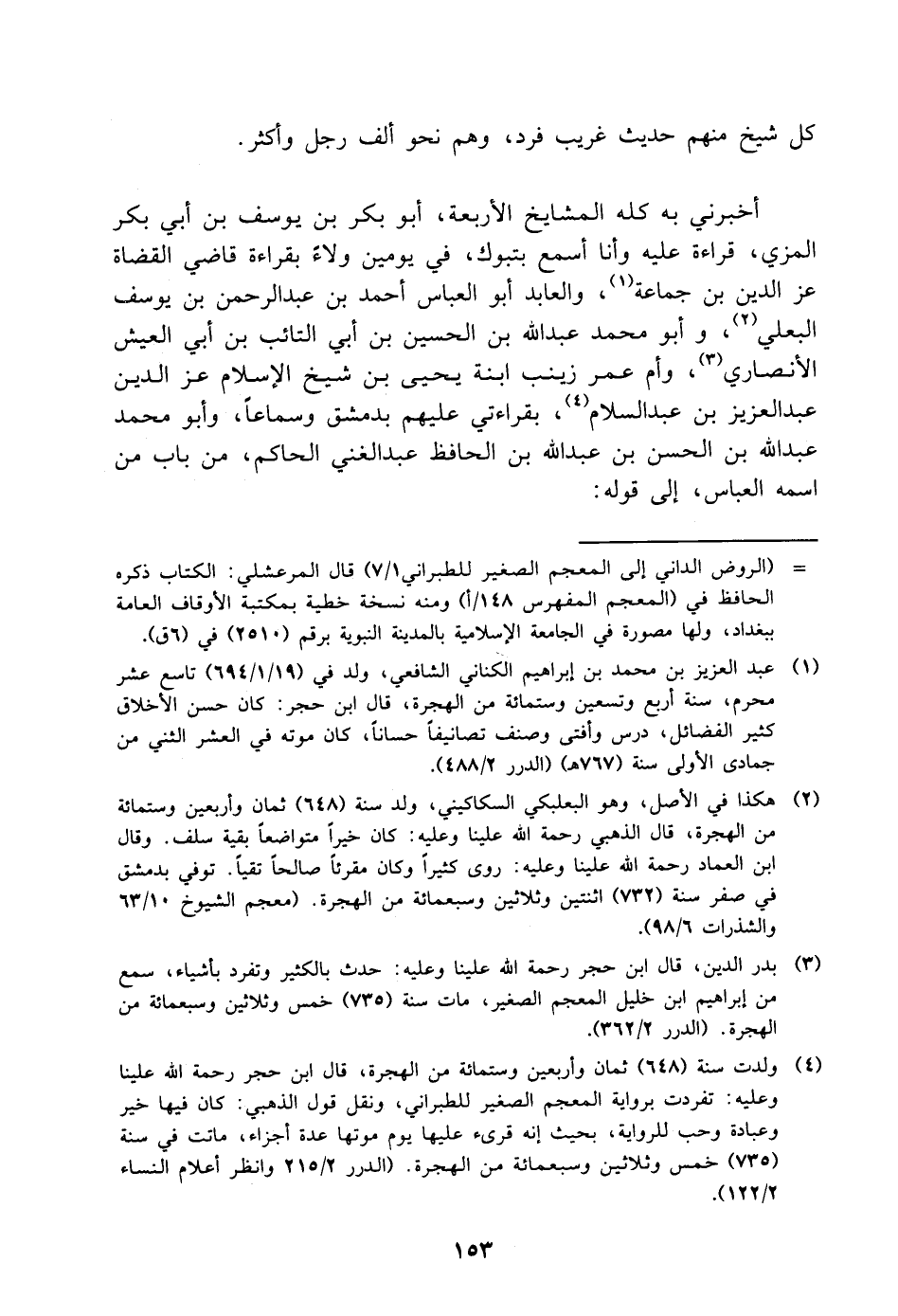 كُلِّ شَيْخٍ مِنْهُمْ حَدِيثٌ غَرِيبٌ فَرْدٌ، وَهُمْ نَحْوُ أَلْفِ رَجُلٍ وَأَكْثَرَ أَخْبَرَنِي بِهِ كُلِّهِ الْمَشَايِخُ الأَرْبَعَةُ أَبُو بَكْرِ بْنُ يُوسُفَ بْنِ أَبِي بَكْرٍ الْمَزِّيُّ، قِرَاءَةً عَلَيْهِ وَأَنَا أَسْمَعُ بِتَبُوكَ، فِي يَوْمَيْنِ وَلاءً بِقِرَاءَةِ قَاضِي الْقُضَاةِ عِزِّ الدِّينِ بْنِ جمَاعَةَ، وَالْعَابِدُ أَبُو الْعَبَّاسِ أَحْمَدُ بْنُ عَبْدِ الرَّحْمَنِ بْنِ يُوسُفَ الْبَعْلِيُّ، وَأَبُو مُحَمَّدٍ عَبْدُ اللَّهِ بْنُ الْحُسَيْنِ بْنِ أَبِي التَّائِبِ بْنِ أَبِي الْعَيْشِ الأَنْصَارِيُّ، وَأُمُّ عُمَرَ زَيْنَبُ ابْنَةُ يَحْيَى بْنِ شَيْخِ الإِسْلامِ عِزِّ الدِّينِ عَبْدِ الْعَزِيزِ بْنِ عَبْدِ السَّلامِ بِقِرَاءَتِي عَلَيْهِمْ بِدِمَشْقَ وَسَمَاعًا، وَأَبُو مُحَمَّدٍ عَبْدُ اللَّهِ بْنُ الْحَسَنِ بْنِ عَبْدِ اللَّهِ بْنِ الْحَافِظِ عَبْدِ الْغَنِيِّ الْحَاكِمُ، مِنْ بَابِ مَنِ اسْمُهُ الْعَبَّاسُ، إِلَى قَوْلِهِ: