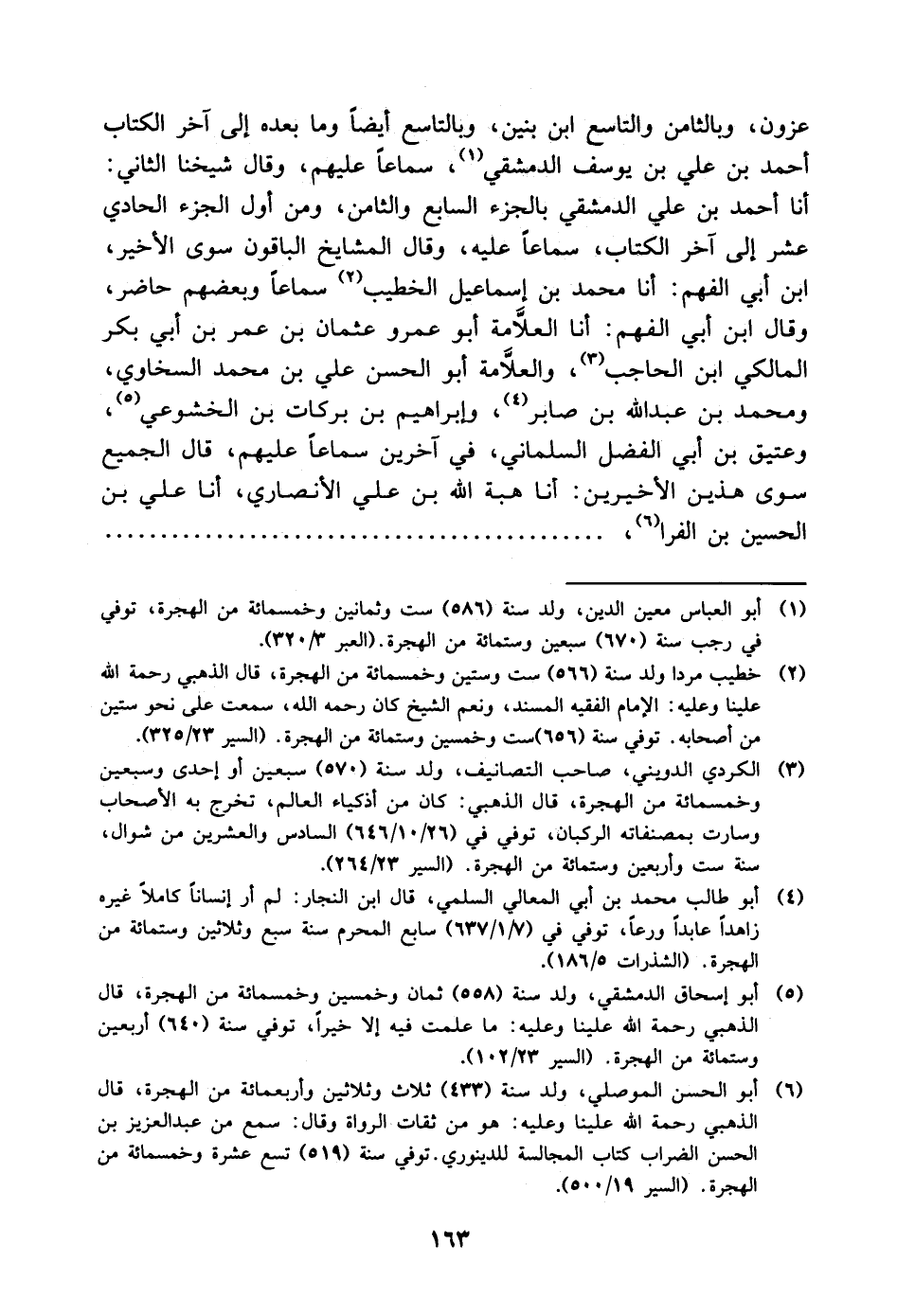عزونَ، وَبِالثَّامِنِ وَالتَّاسِعِ ابْنُ بَنِينٍ، وَبِالتَّاسِعِ أَيْضًا وَمَا بَعْدَهُ إِلَى آخِرِ الْكِتَابِ أَحْمَدُ بْنُ عَلِيِّ بْنِ يُوسُفَ الدِّمَشْقِيُّ سَمَاعًا عَلَيْهِمْ، وَقَالَ شَيْخُنَا الثَّانِي: أنا أَحْمَدُ بْنُ عَلِيٍّ الدِّمَشْقِيُّ بِالْجُزْءِ السَّابِعِ وَالثَّامِنِ، وَمِنْ أَوَّلِ الْجُزْءِ الْحَادِي عَشَرَ إِلَى آخِرِ الْكِتَابِ سَمَاعًا عَلَيْهِ، وَقَالَ الْمَشَايِخُ الْبَاقُونَ سِوَى الأَخِيرِ ابْنِ أَبِي الْفَهْمِ: أنا مُحَمَّدُ بْنُ إِسْمَاعِيلَ الْخَطِيبُ سَمَاعًا وَبَعْضُهُمْ حَاضِرٌ، وَقَالَ ابْنُ أَبِي الْفَهْمِ: أنا الْعَلامَةُ أَبُو عَمْرٍو عُثْمَانُ بْنُ عُمَرَ بْنِ أَبِي بَكْرٍ الْمَالِكِيُّ ابْنِ الْحَاجِبِ، وَالْعَلامَةُ أَبُو الْحَسَنِ عَلِيُّ بْنُ مُحَمَّدٍ السخَاوِيُّ، وَمُحَمَّدُ بْنُ عَبْدِ اللَّهِ بْنِ صَابِرٍ، وَإِبْرَاهِيمُ بْنُ بَرَكَاتِ بْنِ الْخُشُوعِيِّ، وَعَتِيقُ بْنُ أَبِي الْفَضْلِ السَّلْمَانِيُّ، فِي آخَرِينَ سَمَاعًا عَلَيْهِمْ، قَالَ الْجَمِيعُ سِوَى هَذَيْنِ الأَخِيرَيْنِ: أنا هِبَةُ اللَّهِ بْنُ عَلِيٍّ الأَنْصَارِيُّ، أنا عَلِيُّ بْنُ الْحُسَيْنِ بْنِ الْفَرَّا،...................