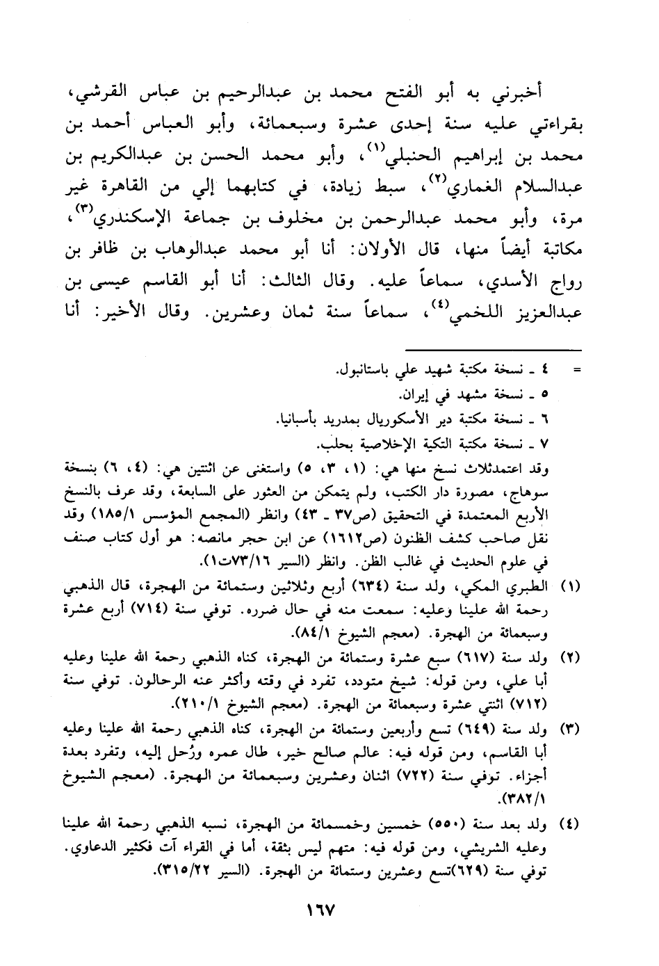 أَخْبَرَنِي بِهِ أَبُو الْفَتْحِ مُحَمَّدُ بْنُ عَبْدِ الرَّحِيمِ بْنِ عَبَّاسٍ الْقُرَشِيُّ، بِقِرَاءَتِي عَلَيْهِ سَنَةَ إِحْدَى عَشْرَةَ وَسَبْعِ مِائَةٍ، وَأَبُو الْعَبَّاسِ أَحْمَدُ بْنُ مُحَمَّدِ بْنِ إِبْرَاهِيمَ الْحَنْبَلِيُّ، وَأَبُو مُحَمَّدٍ الْحَسَنُ بْنُ عَبْدِ الْكَرِيمِ بْنِ عَبْدِ السَّلامِ الْغمَارِيُّ، سِبْطُ زِيَادَةَ، فِي كِتَابِهِمَا إِلَيَّ مِنَ الْقَاهِرَةِ غَيْرَ مَرَّةٍ، وَأَبُو مُحَمَّدٍ عَبْدُ الرَّحْمَنِ بْنُ مَخْلُوفِ بْنِ جمَاعَةَ الإِسْكَنْدَرِيُّ، مُكَاتَبَةً أَيْضًا مِنْهَا، قَالَ الأَوَّلانِ: أنا أَبُو مُحَمَّدٍ عَبْدُ الْوَهَّابِ بْنُ ظَافِرِ بْنِ رَوَّاجٍ الأَسَدِيُّ، سَمَاعًا عَلَيْهِ وَقَالَ الثَّالِثُ: أنا أَبُو الْقَاسِمِ عِيسَى بْنُ عَبْدِ الْعَزِيزِ اللَّخْمِيُّ، سَمَاعًا سَنَةَ ثَمَانٍ وَعِشْرِينَ وَقَالَ الأَخِيرُ: أنا