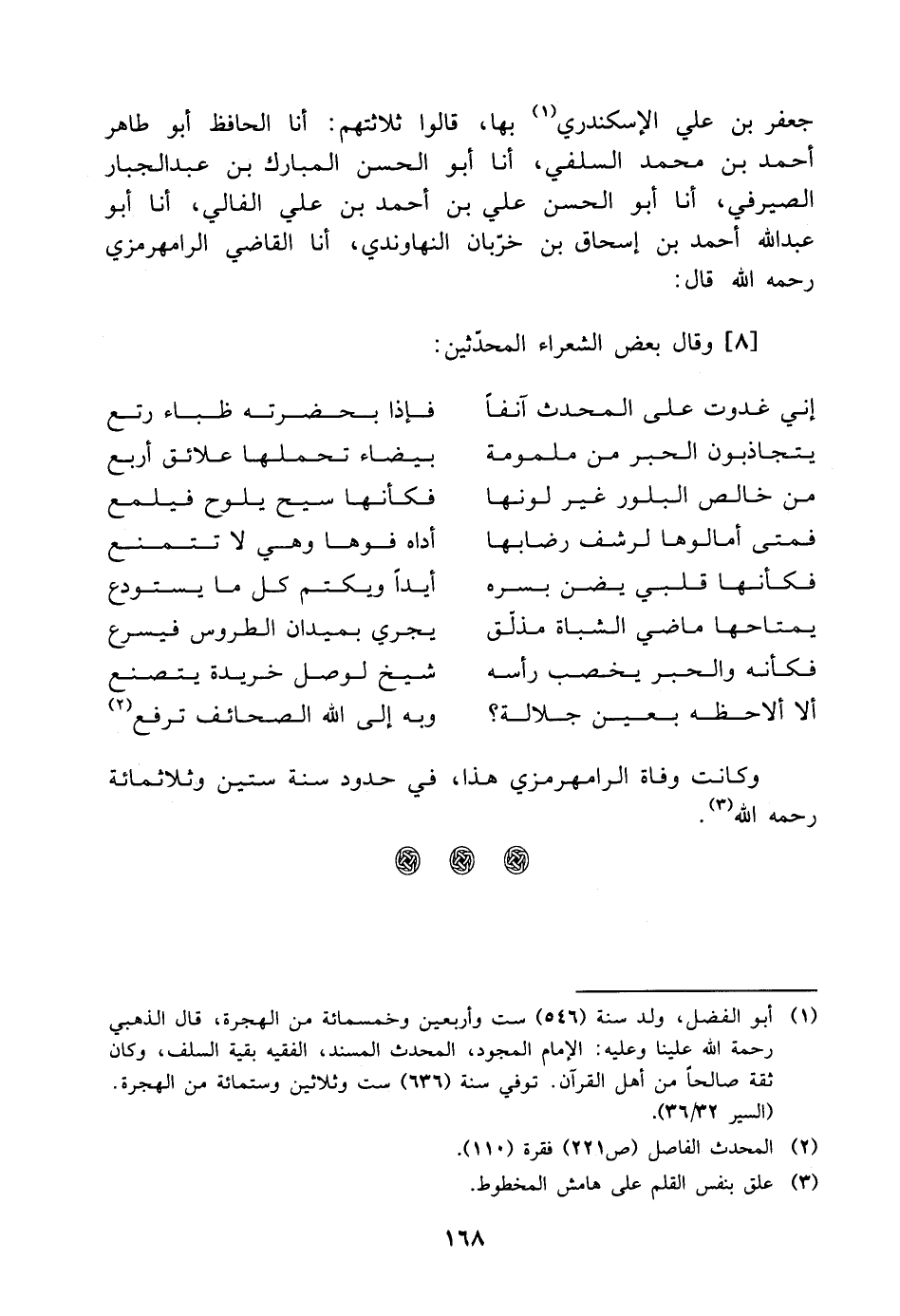 جَعْفَرُ بْنُ عَلِيٍّ الإِسْكَنْدَرِيُّ بِهَا، قَالُوا ثَلاثَتُهُمْ: أنا الْحَافِظُ أَبُو طَاهِرٍ أَحْمَدُ بْنُ مُحَمَّدٍ السِّلَفِيُّ، أنا أَبُو الْحَسَنِ الْمُبَارَكُ بْنُ عَبْدِ الْجَبَّارِ الصَّيْرَفِيُّ، أنا أَبُو الْحَسَنِ عَلِيُّ بْنُ أَحْمَدَ بْنِ عَلِيٍّ الْفَالِيُّ، أنا أَبُو عَبْدِ اللَّهِ أَحْمَدُ بْنُ إِسْحَاقَ بْنِ خربَانَ النُّهَاوَنْدِيُّ، أنا الْقَاضِي الرَّامَهُرْمُزِيُّ رَحِمَهُ اللَّهُ قَالَ: وَقَالَ بَعْضُ الشُّعَرَاءِ الْمُحْدَثِينَ:
