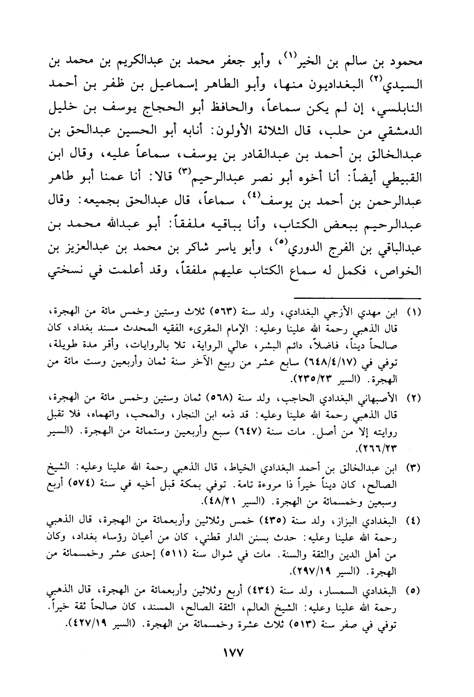مَحْمُودِ بْنِ سَالِمِ بْنِ الْخَيْرِ، وَأَبُو جَعْفَرٍ مُحَمَّدُ بْنُ عَبْدِ الْكَرِيمِ بْنِ مُحَمَّدِ بْنِ السَّيِّدِيِّ الْبَغْدَادِيُّونَ مِنْهَا، وَأَبُو الطَّاهِرِ إِسْمَاعِيلُ بْنُ ظَفَرِ بْنِ أَحْمَدَ النَّابُلُسِيُّ، إِنْ لَمْ يَكُنْ سَمَاعًا، وَالْحَافِظُ أَبُو الْحَجَّاجِ يُوسُفُ بْنُ خَلِيلٍ الدِّمَشْقِيُّ مِنْ حَلَبَ، قَالَ الثَّلاثَةُ الأَوَّلُونَ: أنا بِهِ أَبُو الْحُسَيْنِ عَبْدُ الْحَقِّ بْنُ عَبْدِ الْخَالِقِ بْنِ أَحْمَدَ بْنِ عَبْدِ الْقَادِرِ بْنِ يُوسُفَ سَمَاعًا عَلَيْهِ، وَقَالَ ابْنُ الْقُبَّيْطِيِّ أَيْضًا: أنا أَخُوهُ أَبُو نَصْرٍ عَبْدُ الرَّحِيمِ، قَالا: أنا عَمُّنَا أَبُو طَاهِرٍ عَبْدُ الرَّحْمَنِ بْنُ أَحْمَدَ بْنِ يُوسُفَ سَمَاعًا، قَالَ عَبْدُ الْحَقِّ بِجَمِيعِهِ: وَقَالَ عَبْدُ الرَّحِيمِ بِبَعْضِ الْكِتَابِ، وَأنا بِبَاقِيهِ مُلَفَّقًا: أَبُو عَبْدِ اللَّهِ مُحَمَّدُ بْنُ عَبْدِ الْبَاقِي بْنِ الْفَرَجِ الدُّورِيُّ، وَأَبُو يَاسِرٍ شَاكِرُ بْنُ مُحَمَّدِ بْنِ عَبْدِ الْعَزِيزِ بْنِ الْخَوَّاصِ، فَكَمُلَ لَهُ سَمَاعُ الْكِتَابُ عَلَيْهِمْ مُلَفَّقًا، وَقَدْ أَعْلَمْتُ فِي نُسْخَتِي