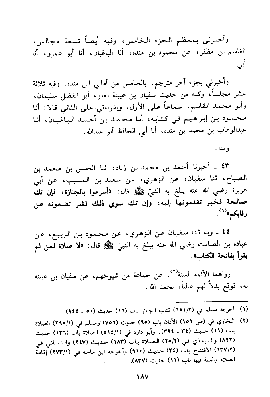 وَأَخْبَرَنِي بِمُعْظَمِ الْجُزْءِ الْخَامِسِ، وَفِيهِ أَيْضًا تِسْعَةُ مَجَالِسَ الْقَاسِمِ بْنِ مُظَفَّرٍ، عَنْ مَحْمُودِ بْنِ مَنْدَهْ، أنا الْبَاغْبَانُ، أنا أَبُو عَمْرٍو، أنا أَبِي وَأَخْبَرَنِي بِجُزْءٍ آخَرَ مُتَرْجَمٍ بِالْخَامِسِ مِنْ أَمَالِي ابْنِ مَنْدَهْ، وَفِيهِ ثَلاثَةَ عَشَرَ مَجْلِسًا، وَكُلُّهُ مِنْ حَدِيثِ سُفْيَانَ بْنِ عُيَيْنَةَ بِعُلُوٍّ، أَبُو الْفَضْلِ سُلَيْمَانُ، وَأَبُو مُحَمَّدٍ الْقَاسِمُ، سَمَاعًا عَلَى الأَوَّلِ، وبِقِرَاءَتِي عَلَى الثَّانِي قَالا: أنا مَحْمُودُ بْنُ إِبْرَاهِيمَ فِي كِتَابِهِ، أنا مُحَمَّدُ بْنُ أَحْمَدَ الْبَاغْبَانُ، أنا عَبْدُ الْوَهَّابِ بْنُ مُحَمَّدِ بْنِ مَنْدَهْ، أنا أَبِي الْحَافِظُ أَبُو عَبْدِ اللَّهِ وَمِنْهُ:
