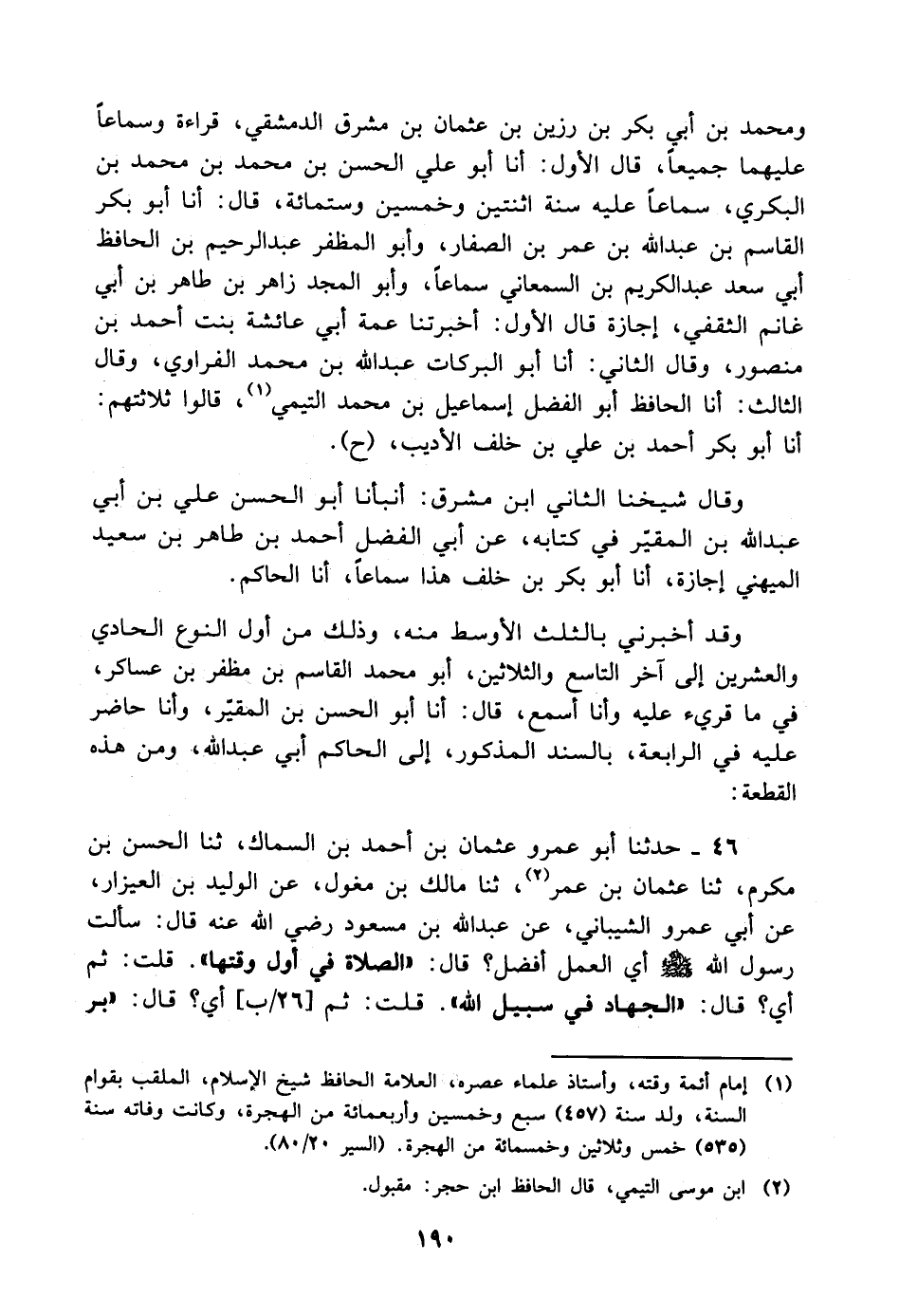 46 - حَدَّثَنَا أَبُو عَمْرٍو عُثْمَانُ بْنُ أَحْمَدَ بْنِ السَّمَّاكِ، ثنا الْحَسَنُ بْنُ مُكْرَمٍ، ثنا عُثْمَانُ بْنُ عُمَرَ، ثنا مَالِكُ بْنُ مِغْوَلٍ، عَنِ الْوَلِيدِ بْنِ الْعَيْزَارِ، عَنْ أَبِي عَمْرٍو الشَّيْبَانِيِّ، عَن عَبْدِ اللَّهِ بْنِ مَسْعُودٍ رَضِيَ اللَّهُ عَنْهُ قَالَ: سَأَلْتُ رَسُولَ اللَّهِ صَلَّى اللَّهُ عَلَيْهِ وَسَلَّمَ أَيُّ الْعَمَلِ أَفْضَلُ؟ قَالَ: " الصَّلاةُ فِي أَوَّلِ وَقْتِهَا "، قُلْتُ: ثُمَّ أَيُّ؟ قَالَ: " الْجِهَادُ فِي سَبِيلِ اللَّهِ "، قُلْتُ: ثُمَّ أَيُّ؟ قَالَ: " بِرُّ