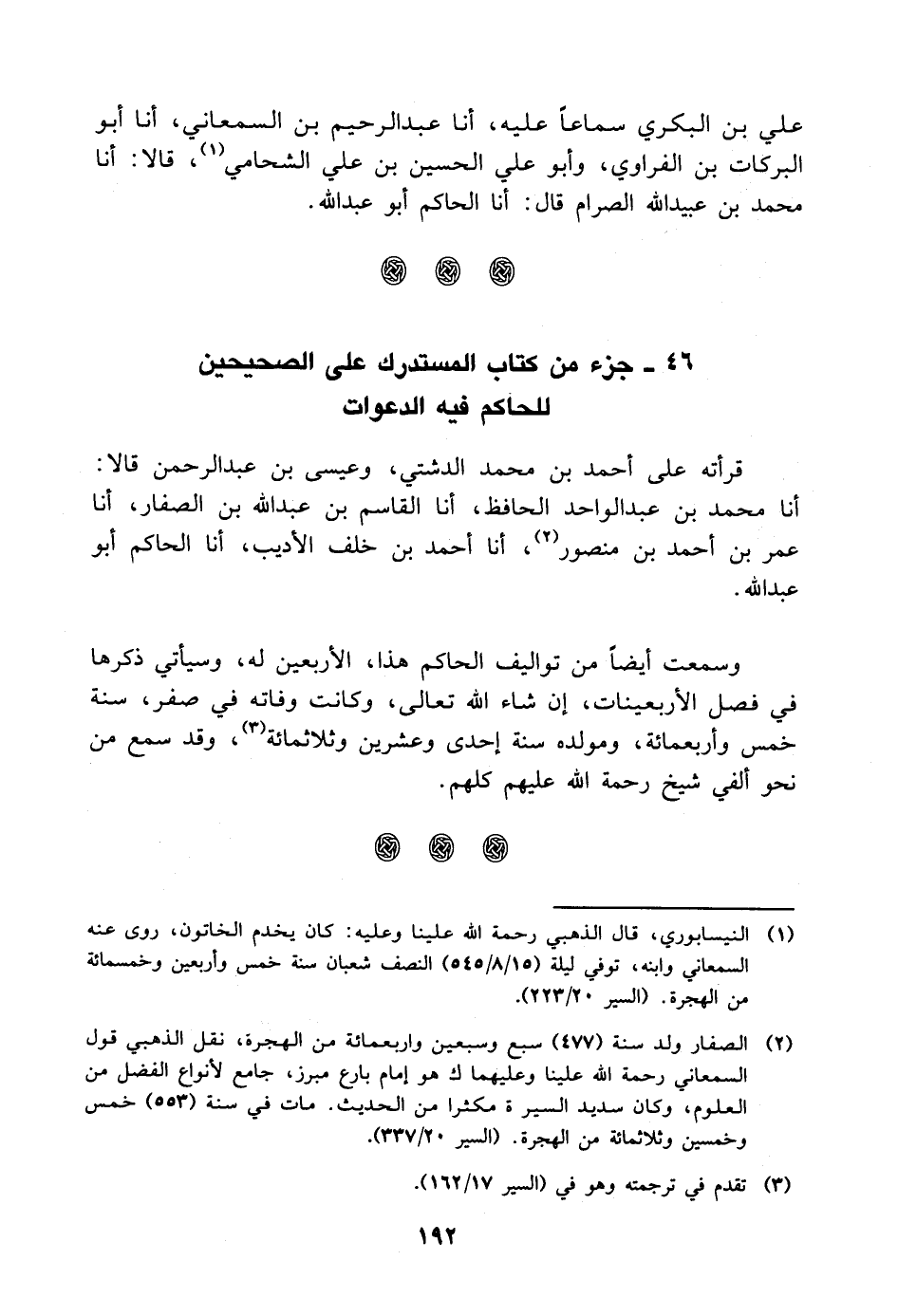 قَرَأْتُهُ عَلَى أَحْمَدَ بْنِ مُحَمَّدٍ الدَّشْتِيِّ، وَعِيسَى بْنِ عَبْدِ الرَّحْمَنِ قَالا: أنا مُحَمَّدُ بْنُ عَبْدِ الْوَاحِدِ الْحَافِظُ، أنا الْقَاسِمُ بْنُ عَبْدِ اللَّهِ بْنِ الصَّفَّارِ، أنا عُمَرُ بْنُ أَحْمَدَ بْنِ مَنْصُورٍ، أنا أَحْمَدُ بْنُ خَلَفٍ الأَدِيبُ، أنا الْحَاكِمُ أَبُو عَبْدِ اللَّهِ وَسَمِعْتُ أَيْضًا مِنْ تَوَالِيفِ الْحَاكِمِ هَذَا الأَرْبَعِينَ لَهُ، وَسَيَأْتِي ذِكْرُهَا فِي فَصْلِ الأَرْبَعِينَاتِ إِنْ شَاءَ اللَّهُ تَعَالَى، وَكَانَتْ وَفَاتُهُ فِي صَفَرٍ سَنَةَ خَمْسٍ وَأَرْبَعِ مِائَةٍ، وَمَوْلِدُهُ سَنَةَ إِحْدَى وَعِشْرِينَ وَثَلاثِ مِائَةٍ، وَقَدْ سَمِعَ مِنْ نَحْوِ أَلْفَيْ شَيْخٍ رَحْمَةُ اللَّهِ عَلَيْهِمْ كُلِّهِمْ