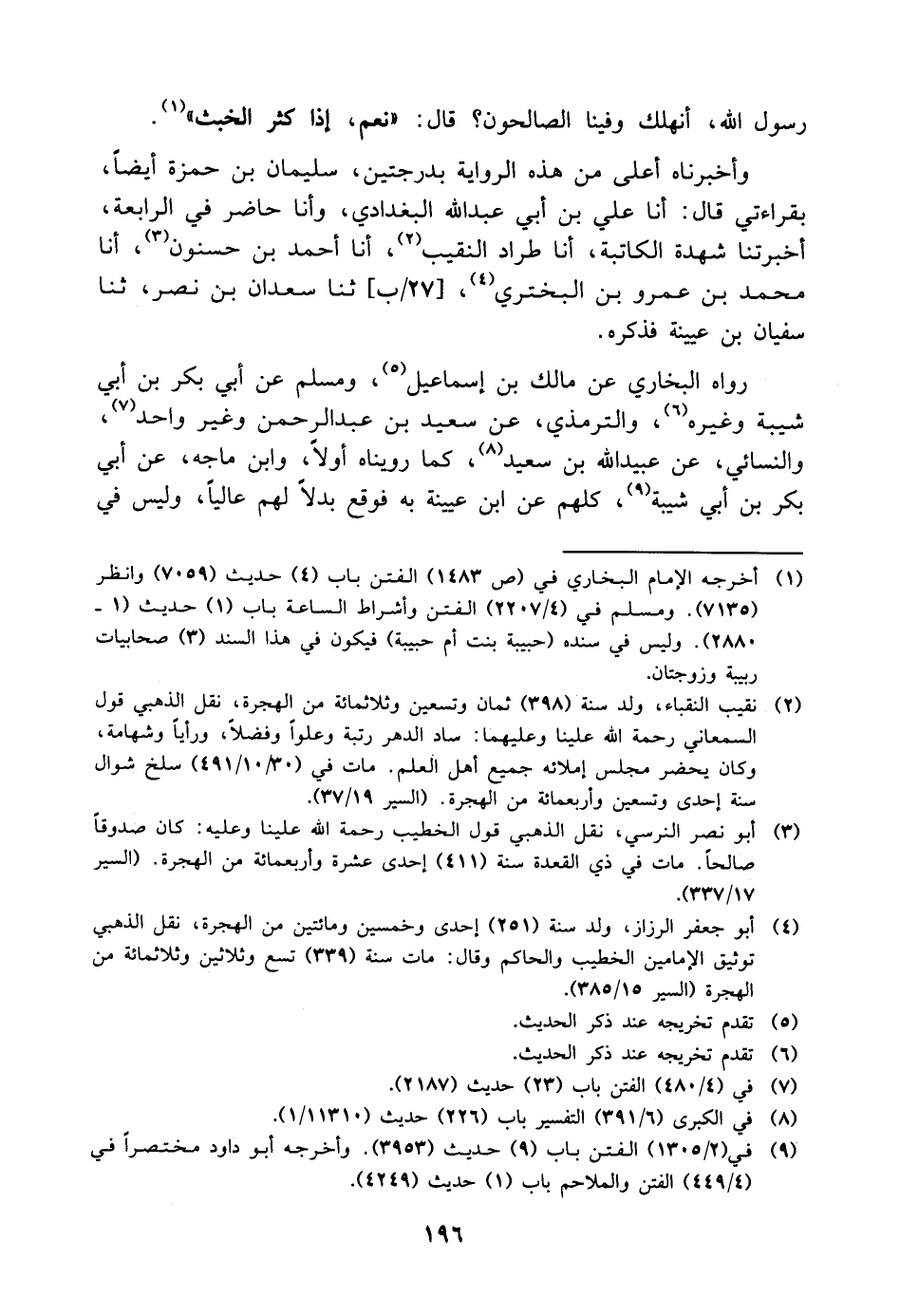 رَسُولَ اللَّهِ، أَنَهْلِكُ وَفِينَا الصَّالِحُونَ؟ قَالَ: " نَعَمْ، إِذَا كَثُرَ الْخَبَثُ " وَأَخْبَرَنَاهُ أَعْلَى مِنْ هَذِهِ الرِّوَايَةِ بِدَرَجَتَيْنِ سُلَيْمَانُ بْنُ حَمْزَةَ أَيْضًا بِقِرَاءَتِي، قَالَ: أنا عَلِيُّ بْنُ أَبِي عَبْدِ اللَّهِ الْبَغْدَادِيُّ، وَأَنَا حَاضِرٌ فِي الرَّابِعَةِ، أَخْبَرَتْنَا شُهْدَةُ الْكَاتِبَةُ، أنا طَرَّادٌ النَّقِيبُ، أنا أَحْمَدُ بْنُ حُسْنُونٍ، أنا مُحَمَّدُ بْنُ عَمْرِو بْنِ الْبَخْتَرِيِّ، ثنا سَعْدَانُ بْنُ نَصْرٍ، ثنا سُفْيَانُ بْنُ عُيَيْنَةَ فَذَكَرَهُ رَوَاهُ الْبُخَارِيُّ، عَنْ مَالِكِ بْنِ إِسْمَاعِيلَ، وَمُسْلِمٌ، عَنْ أَبِي بَكْرِ بْنِ أَبِي شَيْبَةَ وَغَيْرِهِ، وَالتِّرْمِذِيُّ، عَنْ سَعِيدِ بْنِ عَبْدِ الرَّحْمَنِ وَغَيْرِ وَاحِدٍ، وَالنَّسَائِيُّ، عَنْ عُبَيْدِ اللَّهِ بْنِ سَعِيدٍ، كَمَا رَوَيْنَاهُ أَوَّلا، وَابْنُ مَاجَهْ، عَنْ أَبِي بَكْرِ بْنِ أَبِي شَيْبَةَ، كُلُّهُمْ عَنِ ابْنِ عُيَيْنَةَ بِهِ فَوَقَعَ بَدَلا لَهُمْ عَالِيًا، وَلَيْسَ فِي