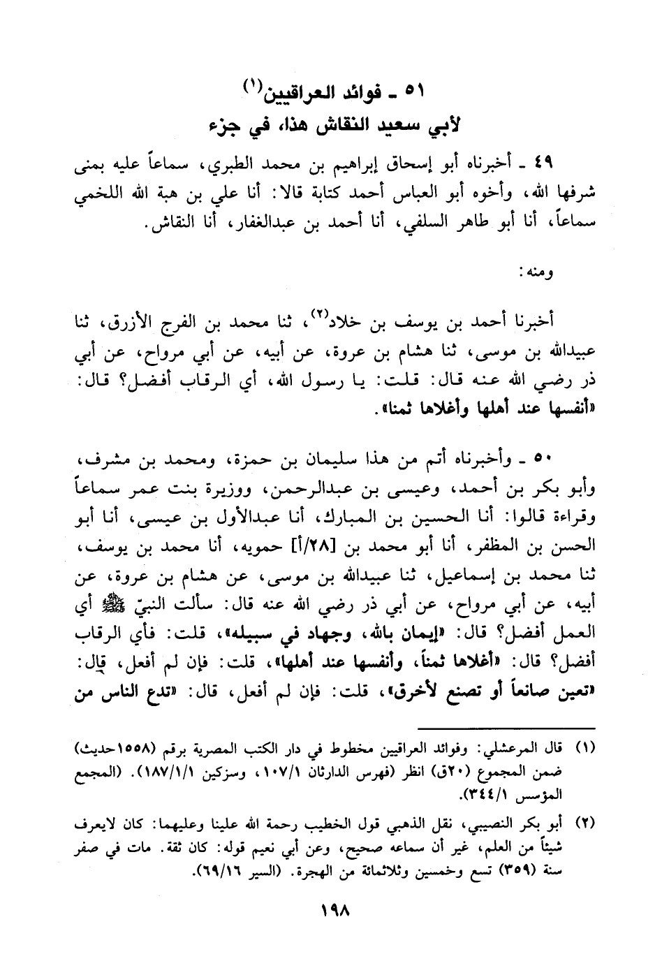 50 - وَأَخْبَرَنَاهُ أَتَمَّ مِنْ هَذَا سُلَيْمَانُ بْنُ حَمْزَةَ، وَمُحَمَّدُ بْنُ مُشْرِفٍ، وَأَبُو بَكْرِ بْنُ أَحْمَدَ، وَعِيسَى بْنُ عَبْدِ الرَّحْمَنِ، وَوَزِيرَةُ بِنْتُ عُمَرَ سَمَاعًا وَقِرَاءَةً قَالُوا: أنا الْحُسَيْنُ بْنُ الْمُبَارَكِ، أنا عَبْدُ الأَوَّلِ بْنُ عِيسَى، أنا أَبُو الْحَسَنِ بْنُ الْمُظَفَّرِ، أنا أَبُو مُحَمَّدِ بْنُ حَمُّوَيْهِ، أنا مُحَمَّدُ بْنُ يُوسُفَ، ثنا مُحَمَّدُ بْنُ إِسْمَاعِيلَ، ثنا عُبَيْدُ اللَّهِ بْنُ مُوسَى، عَنْ هِشَامِ بْنِ عُرْوَةَ، عَنْ أَبِيهِ، عَنْ أَبِي مُرَاوِحٍ، عَنْ أَبِي ذَرٍّ رَضِيَ اللَّهُ عَنْهُ قَالَ: سَأَلْتُ النَّبِيَّ صَلَّى اللَّهُ عَلَيْهِ وَسَلَّمَ أَيُّ الْعَمَلِ أَفْضَلُ؟ قَالَ: " إِيمَانٌ بِاللَّهِ وَجِهَادٌ فِي سَبِيلِهِ "، قُلْتُ: فَأَيُّ الرِّقَابِ أَفْضَلُ؟ قَالَ: " أَغْلاهَا ثَمَنًا وَأَنْفَسُهَا عِنْدَ أَهْلِهَا "، قُلْتُ: فَإِنْ لَمْ أَفْعَلْ، قَالَ: " تُعِينُ صَانِعًا أَوْ تَصْنَعُ لأَخْرَقَ "، قُلْتُ: فَإِنْ لَمْ أَفْعَلْ، قَالَ: " تَدْعُ النَّاسَ مِنَ