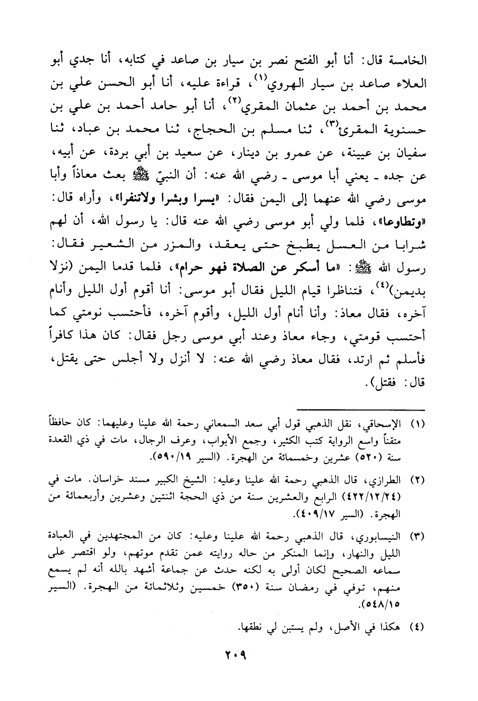 الْخَامِسَةِ قَالَ: أنا أَبُو الْفَتْحِ نَصْرُ بْنُ سَيَّارِ بْنِ صَاعِدٍ فِي كِتَابِهِ، أنا جَدِّي أَبُو الْعَلاءِ صَاعِدُ بْنُ سَيَّارٍ الْهَرَوِيُّ، قِرَاءَةً عَلَيْهِ، أنا أَبُو الْحَسَنِ عَلِيُّ بْنُ مُحَمَّدِ بْنِ أَحْمَدَ بْنِ عُثْمَانَ الْمُقْرِئُ، أنا أَبُو حَامِدٍ أَحْمَدُ بْنُ عَلِيِّ بْنِ حَسْنَوَيْهِ الْمُقْرِئُ، ثنا مُسْلِمُ بْنُ الْحَجَّاجِ، ثنا مُحَمَّدُ بْنُ عَبَّادٍ، ثنا سُفْيَانُ بْنُ عُيَيْنَةَ، عَنْ عَمْرِو بْنِ دِينَارٍ، عَنْ سَعِيدِ بْنِ أَبِي بُرْدَةَ، عَنْ أَبِيهِ، عَنْ جَدِّهِ يَعْنِي أَبَا مُوسَى رَضِيَ اللَّهُ عَنْهُ: أَنَّ النَّبِيَّ صَلَّى اللَّهُ عَلَيْهِ وَسَلَّمَ بَعَثَ مُعَاذًا وَأَبَا مُوسَى رَضِيَ اللَّهُ عَنْهُمَا إِلَى الْيَمَنِ فَقَالَ: " يَسِّرَا وَبَشِّرَا وَلا تُنَفِّرَا، وَأَرَاهُ قَالَ: وَتَطَاوَعَا "