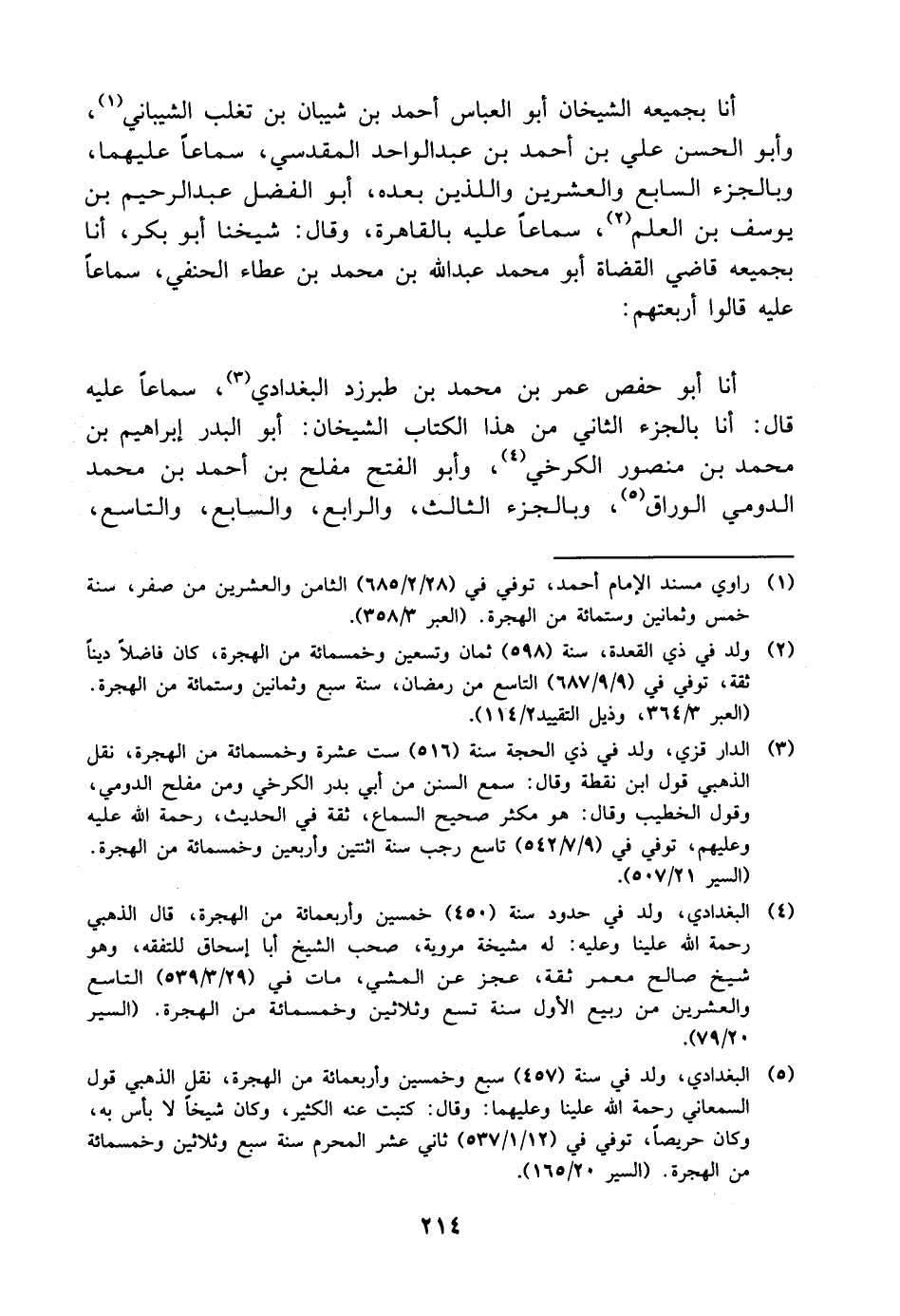 بْن شيبان بْن تغلب الشيباني، وأبو الحسن علي بْن أَحْمَد بْن عَبْد الواحد الْمَقْدِسِيّ، سماعا عليهما، وبالجزء السابع والعشرين واللذين بعده، أَبُو الفضل عَبْد الرحيم بْن يوسف بْن العلم، سماعا عليه بالقاهرة، وقال: شيخنا أَبُو بكر، أنا بجميعه قاضي القضاة أَبُو مُحَمَّد عَبْد اللَّه بْن مُحَمَّد بْن عطاء الحنفي، سماعا عليه قالوا أربعتهم: أنا أَبُو حفص عمر بْن مُحَمَّد بْن طبرزد البغدادي، سماعا عليه قَالَ: أنا بالجزء الثاني من هذا الكتاب الشيخان: أَبُو البدر إبراهيم بْن مُحَمَّد بْن منصور الكرخي، وأبو الفتح مفلح بْن أَحْمَد بْن مُحَمَّد الدومي الوراق، وبالجزء الثالث، والرابع، والسابع، والتاسع،