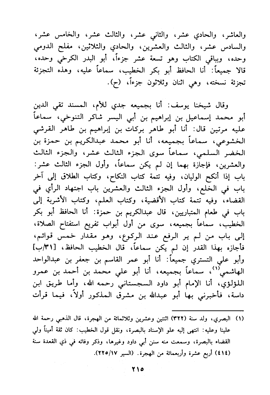 والعاشر، والحادي عشر، والثاني عشر، والثالث عشر، والخامس عشر، والسادس عشر، والثالث والعشرين، والحادي والثلاثين، مفلح الدومي وحده، وبباقي الكتاب وهو تسعة عشر جزءا، أَبُو البدر الكرخي وحده، قالا جميعا: أنا الحافظ أَبُو بكر الخطيب، سماعا عليه، وهذه التجزئة تجزئة نسخته، وهي اثنان وثلاثون جزءا، ح وقال شيخنا يوسف: أنا بجميعه جدي للأم، المسند تقي الدين أَبُو مُحَمَّد إسماعيل بْن إبراهيم بْن أَبِي اليسر شاكر التنوخي، سماعا عليه مرتين قَالَ: أنا أَبُو طاهر بركات بْن إبراهيم بْن طاهر القرشي الخشوعي، سماعا بجميعه، أنا أَبُو محمد