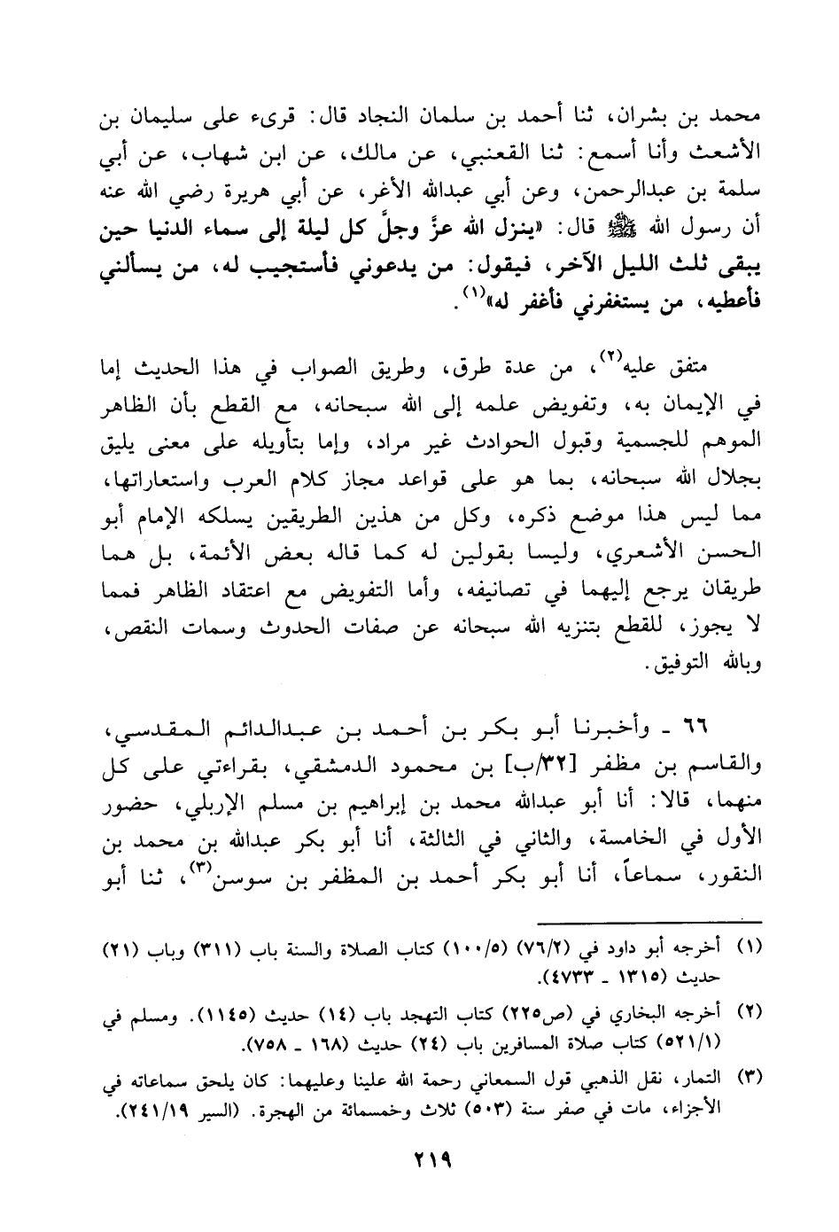 مُحَمَّدِ بْنِ بِشْرَانَ، ثنا أَحْمَدُ بْنُ سَلْمَانَ النَّجَّادُ، قَالَ: قُرِئَ عَلَى سُلَيْمَانَ بْنِ الأَشْعَثِ وَأَنَا أَسْمَعُ: ثنا الْقَعْنَبِيُّ، عَنْ مَالِكٍ، عَنِ ابْنِ شِهَابٍ، عَنْ أَبِي سَلَمَةَ بْنِ عَبْدِ الرَّحْمَنِ، وَعَنْ أَبِي عَبْدِ اللَّهِ الأَغَرِّ، عَنْ أَبِي هُرَيْرَةَ رَضِيَ اللَّهُ عَنْهُ أَنَّ رَسُولَ اللَّهِ صَلَّى اللَّهُ عَلَيْهِ وَسَلَّمَ قَالَ: " يَنْزِلُ اللَّهُ عَزَّ وَجَلَّ كُلَّ لَيْلَةٍ إِلَى سَمَاءِ الدُّنْيَا حِينَ يَبْقَى ثُلُثُ اللَّيْلِ الآخِرِ، فَيَقُولُ: مَنْ يَدْعُونِي فَأَسْتَجِيبَ لَهُ، مَنْ يَسْأَلُنِي فَأُعْطِيَهُ، مَنْ يَسْتَغْفِرُنِي فَأَغْفِرَ لَهُ " مُتَّفَقٌ عَلَيْهِ، مِنْ عِدَّةِ طُرُقٍ، وَطَرِيقُ الصَّوَابِ فِي هَذَا الْحَدِيثِ إِمَّا فِي الإِيمَانِ بِهِ وَتَفْوِيضِ عِلْمِهِ إِلَى اللَّهِ سُبْحَانَهُ، مَعَ الْقَطْعِ بِأَنَّ الظَّاهِرَ الْمُوهِمَ لِلْجِسْمِيَّةِ وَقُبُولَ الْحَوَادِثِ غَيْرُ مُرَادٍ، وَإِمَّا بِتَأْوِيلِهِ عَلَى مَعْنَى يَلِيقُ بِجَلالِ اللَّهِ سُبْحَانَهُ، بِمَا هُوَ عَلى قَوَاعِدِ مَجَازِ كَلامِ الْعَرَبِ وَاسْتِعَارَاتِهَا، مِمَّا لَيْسَ هَذَا مَوْضِعَ ذِكْرِهِ، وَكُلٌّ مِنْ هَذَيْنِ الطَّرِيقَيْنِ يَسْلُكُهُ الإِمَامُ أَبُو الْحَسَنِ الأَشْعَرِيُّ، وَلَيْسَا بِقَوْلَيْنِ لَهُ كَمَا قَالَهُ بَعْضُ الأَئِمَّةِ، بَلْ هُمَا طَرِيقَانِ يَرْجِعُ إِلَيْهِمَا فِي تَصَانِيفِهِ، وَأَمَّا التَّفْوِيضُ مَعَ اعْتِقَادِ الظَّاهِرِ فَمِمَّا لا يَجُوزُ، لِلْقَطْعِ بِتَنْزِيهِ اللَّهِ سُبْحَانَهُ عَنْ صِفَاتِ الْحُدُوثِ وَسِمَاتِ النَّقْضِ، وَبِاللَّهِ التَّوْفِيقُ