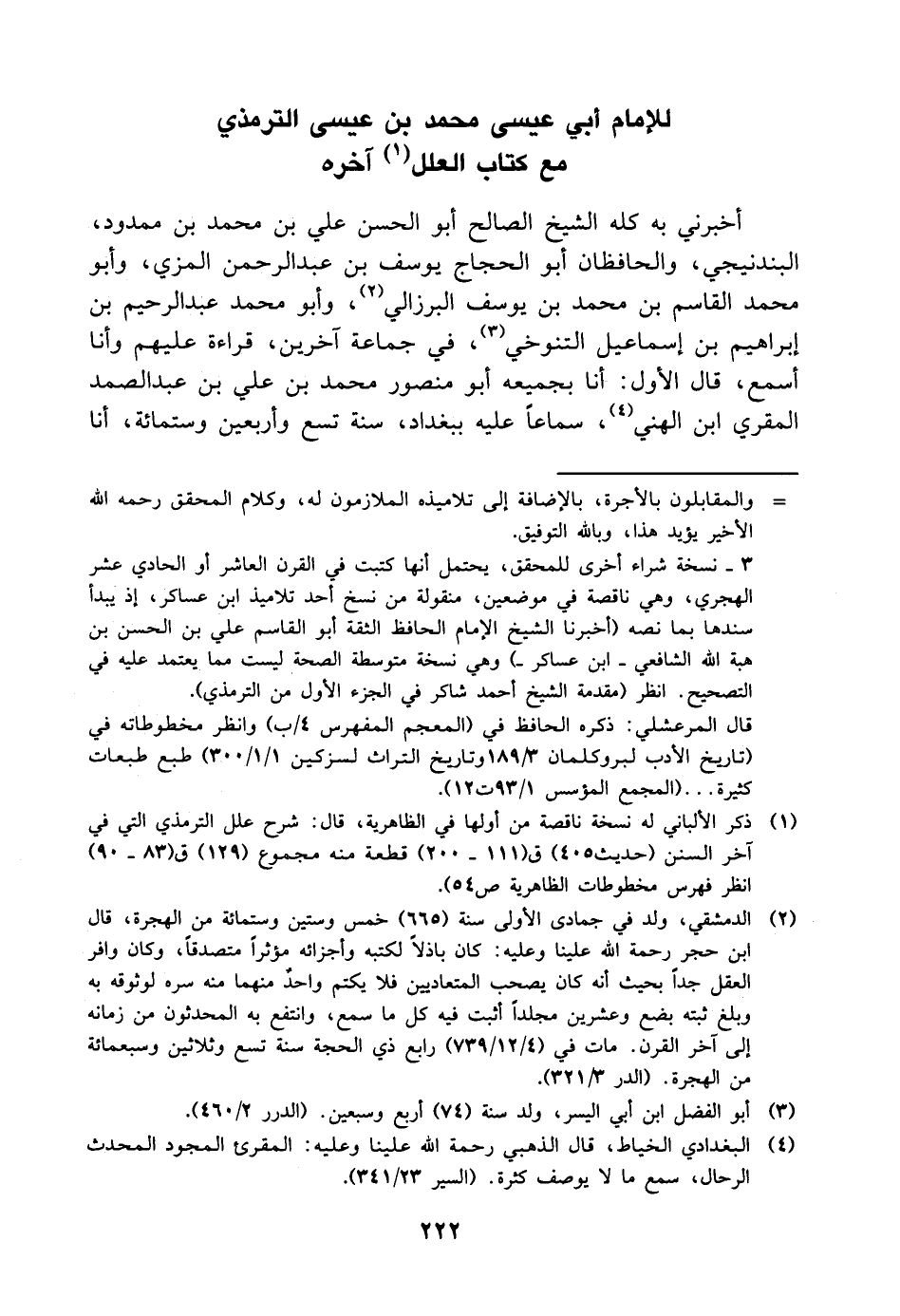 للإِمَامِ أَبِي عِيسَى مُحَمَّدِ بْنِ عِيسَى التِّرْمِذِيِّ مع كتاب العلل آخره أخبرني به كله الشيخ الصالح أَبُو الحسن علي بْن مُحَمَّد بْن ممدود، البندنيجي، والحافظان أَبُو الحجاج يوسف بْن عَبْد الرحمن المزي، وأبو مُحَمَّد الْقَاسِم بْن مُحَمَّد بْن يوسف البرزالي، وأبو مُحَمَّد عَبْد الرحيم بْن إبراهيم بْن إسماعيل التنوخي، في جماعة آخرين، قراءة عليهم وأنا أسمع، قَالَ الأول: أنا بجميعه أَبُو منصور مُحَمَّد بْن علي بْن عَبْد الصمد المقري ابن الهني، سماعا عليه ببغداد، سنة تسع وأربعين وست مائة، أنا