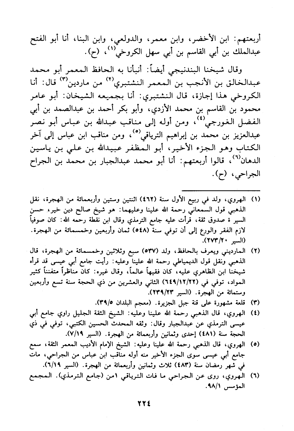 معمر، والدولعي، وابن البنا، أنا أَبُو الفتح عَبْد الملك بْن أَبِي الْقَاسِم بْن أَبِي سهل الكروخي، ح وقال شيخنا البندنيجي أيضا: أنبأنا به الحافظ المعمر أَبُو مُحَمَّد عَبْد الخالق بْن الأنجب بْن المعمر النشتبري من ماردين قَالَ: أنا الكروخي هذا إجازة، قَالَ النشتبري: أنا بجميعه الشيخان: أَبُو عامر محمود بْن الْقَاسِم بْن مُحَمَّد الأزدي، وأبو بكر أَحْمَد بْن عَبْد الصمد بْن أَبِي الفضل الغورجي، ومن أوله إلى مناقب عَبْد اللَّه بْن عباس أَبُو نصر عَبْد العزيز بْن مُحَمَّد بْن إبراهيم الترياقي، ومن مناقب ابن عباس إلى آخر الكتاب وهو الجزء الأخير، أَبُو المظفر عبيد اللَّه بْن علي بْن ياسين الدهان، قالوا أربعتهم: أنا أَبُو محمد عَبْد الجبار بْن مُحَمَّد بْن الجراح الجراحي، ح.