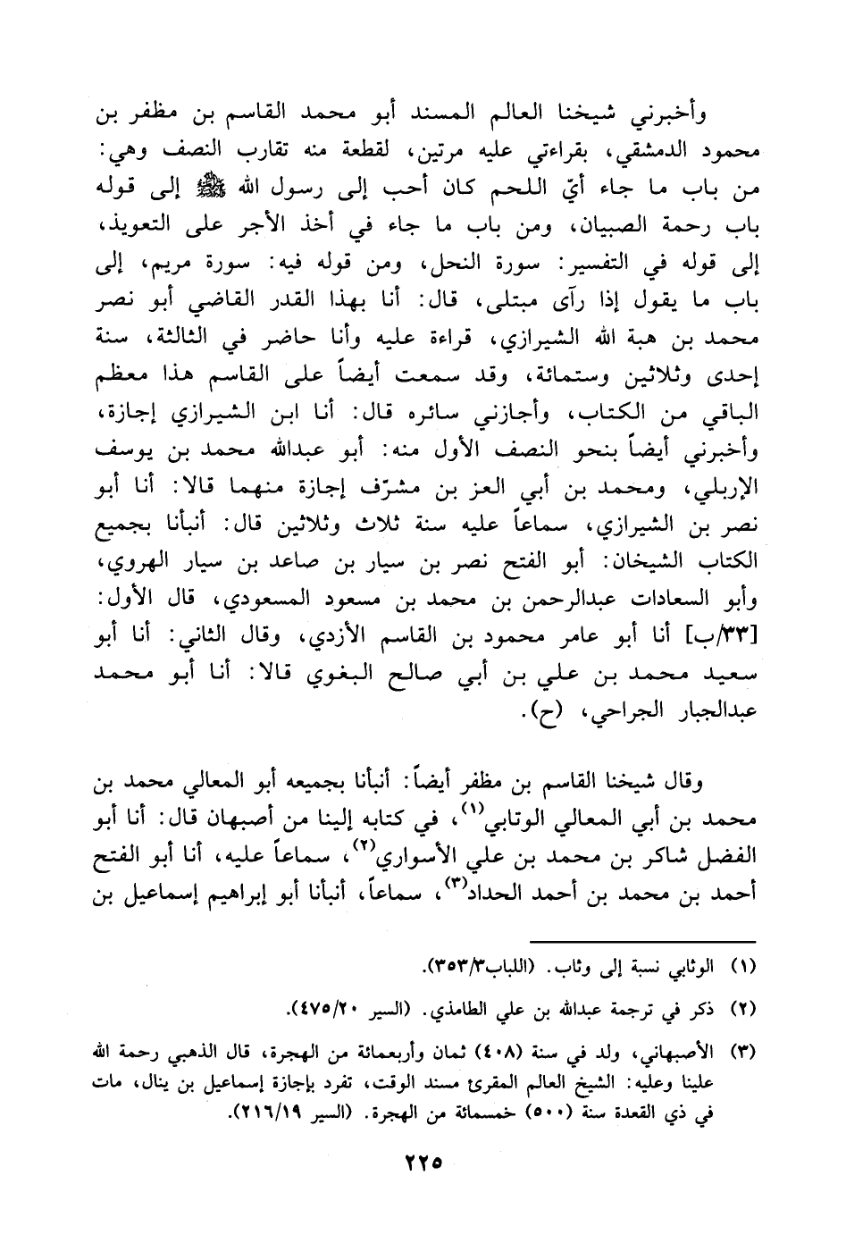 قراءة عليه وأنا حاضر في الثالثة، سنة إحدى وثلاثين وست مائة، وقد سمعت أيضا على الْقَاسِم هذا معظم الباقي من الكتاب، وأجازني سائره قَالَ: أنا ابن الشيرازي إجازة، وأخبرني أيضا بنحو النصف الأول منه: أَبُو عَبْد اللَّه مُحَمَّد بْن يوسف الإربلي، ومحمد بْن أَبِي العز بْن مشرف إجازة منهما قالا: أنا أَبُو نصر بْن الشيرازي، سماعا عليه سنة ثلاث وثلاثين قَالَ: أنبأنا بجميع الكتاب الشيخان: أَبُو الفتح نصر بْن سيار بْن صاعد بْن سيار الهروي، وأبو السعادات عَبْد الرحمن بْن مُحَمَّد بْن مسعود المسعودي، قَالَ الأول: أنا أَبُو عامر محمود بْن الْقَاسِم الأزدي، وقال الثاني: أنا أَبُو سعيد مُحَمَّد بْن علي بْن أَبِي صالح البغوي قالا: أنا أَبُو محمد عَبْد الجبار الجراحي، ح وقال شيخنا الْقَاسِم بْن مظفر أيضا: أنبأنا بجميعه أَبُو المعالي مُحَمَّد بْن مُحَمَّد بْن أَبِي المعالي الوتابي، في كتابه إلينا من أصبهان قَالَ: أنا أَبُو الفضل شاكر بْن مُحَمَّد بْن علي الأسواري، سماعا عليه، أنا أَبُو الفتح أَحْمَد بْن مُحَمَّد بْن أَحْمَد الحداد، سماعا، أنبأنا أَبُو إبراهيم إسماعيل بْن