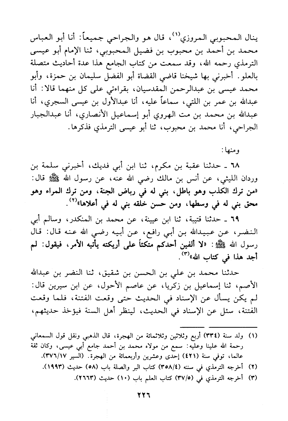 الجامع هذا عدة أحاديث متصلة بالعلو أخبرني بها شيخنا قاضي القضاة أَبُو الفضل سليمان بْن حمزة، وأبو مُحَمَّد عيسى بْن عَبْد الرحمن الْمَقْدِسِيّان، بِقِرَاءَتِي على كل منهما قالا: أنا عَبْد اللَّه بْن عمر بْن اللتي، سماعا عليه، أنا عَبْد الأول بْن عيسى السجري، أنا عَبْد اللَّه بْن مُحَمَّد بْن مت الهروي أَبُو إسماعيل الأنصاري، أنا عَبْد الجبار الجراحي، أنا محمد بْن محبوب، ثنا أَبُو عيسى التِّرْمِذِيّ فذكرها ومنها: