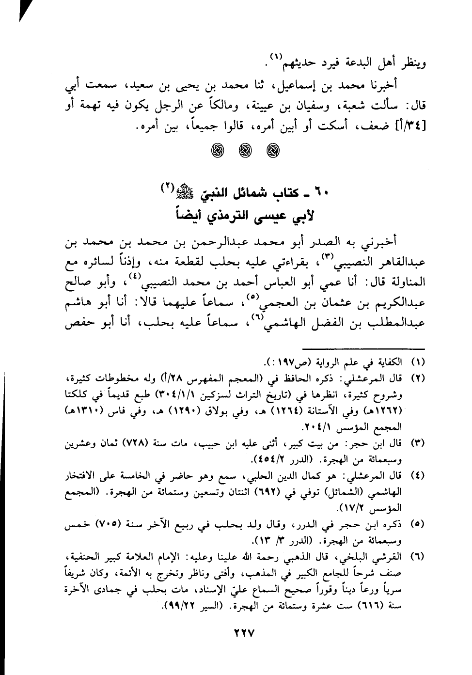 أخبرني به الصدر أَبُو مُحَمَّد عَبْد الرحمن بْن مُحَمَّد بْن مُحَمَّد بْن عَبْد القاهر النصيبي، بِقِرَاءَتِي عليه بحلب لقطعة منه، وإذنا لسائره مع المناولة قَالَ: أنا عمي أَبُو العباس أَحْمَد بْن مُحَمَّد النصيبي، وأبو صالح عَبْد الكريم بْن عثمان بْن العجمي، سماعا عليهما قالا: أنا أَبُو هاشم عَبْد المطلب بْن الفضل الهاشمي، سماعا عليه بحلب، أنا أَبُو حفص