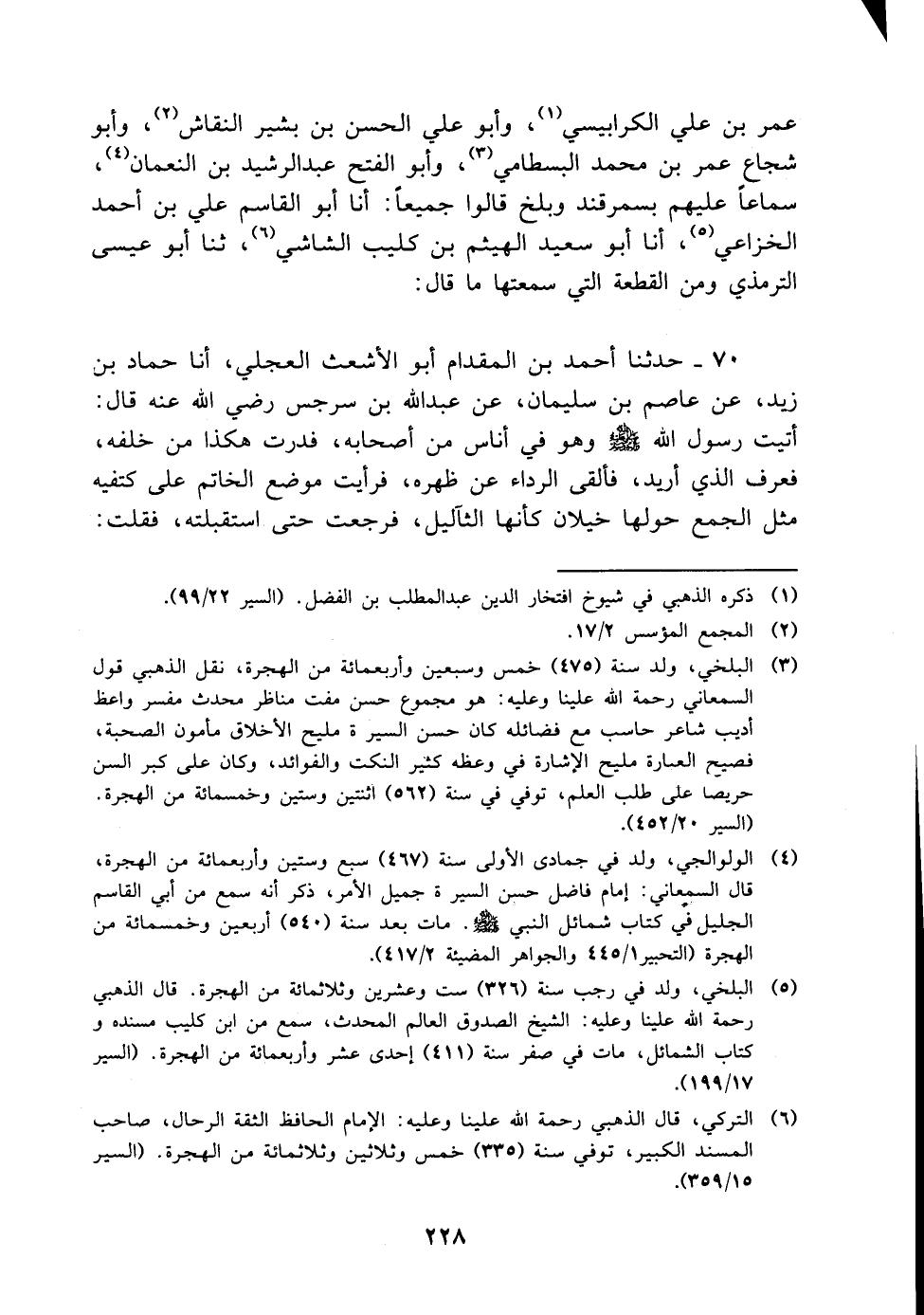 عمر بْن علي الكرابيسي، وأبو علي الحسن بْن بشير النقاش، وأبو شجاع عمر بْن مُحَمَّد البسطامي، وأبو الفتح عَبْد الرشيد بْن النعمان، سماعا عليهم بسمرقند وبلخ قالوا جميعا: أنا أَبُو الْقَاسِم علي بْن أَحْمَد الخزاعي، أنا أَبُو سعيد الهيثم بْن كليب الشاشي، ثنا أَبُو عيسى التِّرْمِذِيّ ومن القطعة التي سمعتها ما قَالَ: