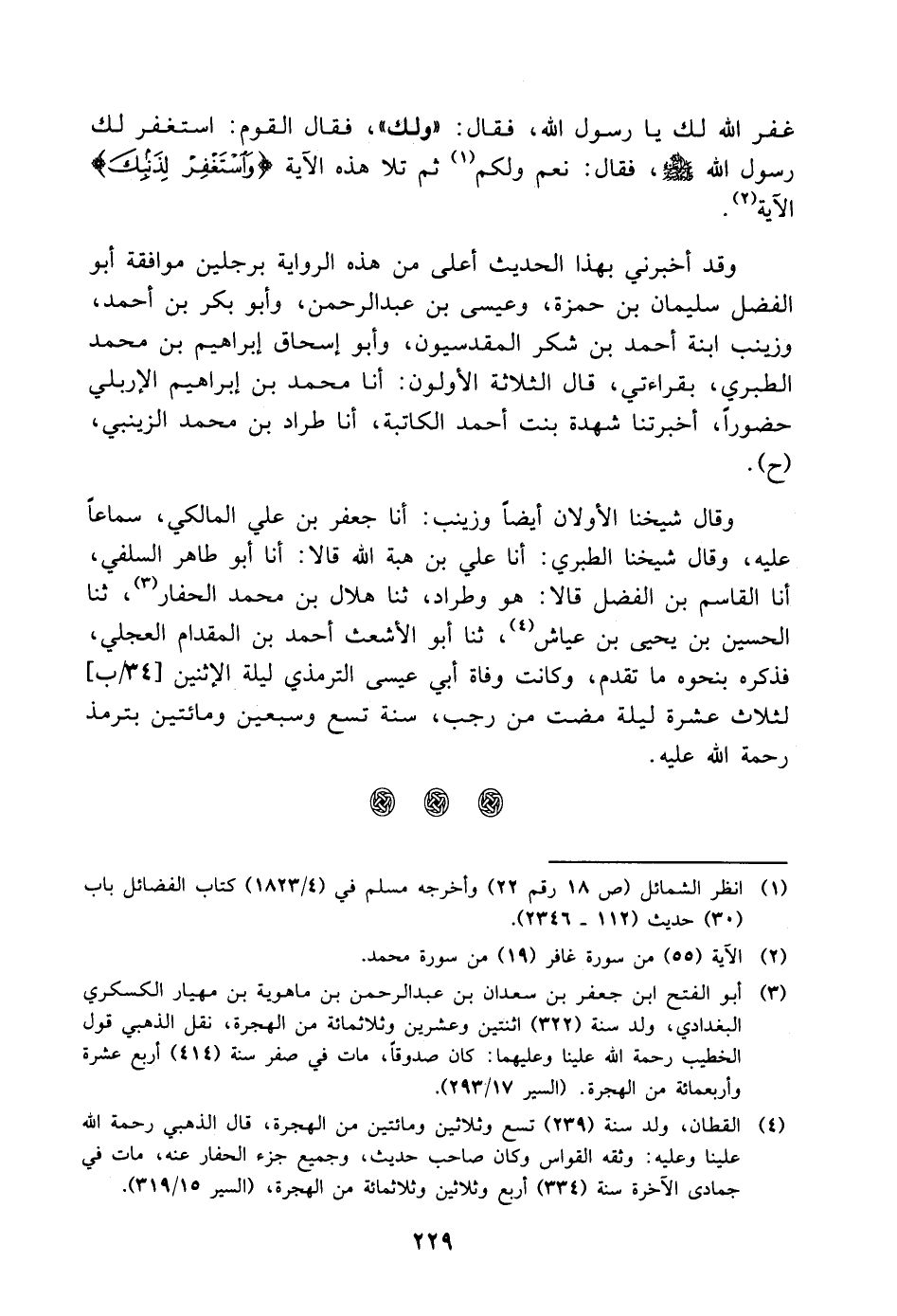 غَفَرَ اللَّهُ لَكَ يَا رَسُولَ اللَّهِ، فَقَالَ: وَلَكَ، فَقَالَ الْقَوْمُ: اسْتَغْفَرَ لَكَ رَسُولُ اللَّهِ صَلَّى اللَّهُ عَلَيْهِ وَسَلَّمَ، فَقَالَ: نَعَمْ وَلَكُمْ، ثُمَّ تَلا هَذِهِ الآيَةَ: وَاسْتَغْفِرْ لِذَنْبِكَ الآيَةَ وَقَدْ أَخْبَرَنِي بِهَذَا الْحَدِيثِ أَعْلَى مِنْ هَذِهِ الرِّوَايَةِ بِرَجُلَيْنِ مُوَافَقَةً أَبُو الْفَضْلِ سُلَيْمَانُ بْنُ حَمْزَةَ، وَعِيسَى بْنُ عَبْدِ الرَّحْمَنِ، وَأَبُو بَكْرِ بْنُ أَحْمَدَ، وَزَيْنَبُ ابْنَةُ أَحْمَدَ بْنِ شُكْرٍ الْمَقْدِسِيُّونَ، وَأَبُو إِسْحَاقَ إِبْرَاهِيمُ بْنُ مُحَمَّدٍ الطَّبَرِيُّ، بِقِرَاءَتِي، قَالَ الثَّلاثَةُ الأَوَّلُونَ: أنا مُحَمَّدُ بْنُ إِبْرَاهِيمَ الإِرْبِلِيُّ حُضُورًا، أَخْبَرَتْنَا شُهْدَةُ بِنْتُ أَحْمَدَ الْكَاتِبَةُ، أنا طَرَّادُ بْنُ مُحَمَّدٍ الزَّيْنَبِيُّ، ح وَقَالَ شَيْخُنَا الأَوَّلانِ أَيْضًا وَزَيْنَبُ: أنا جَعْفَرُ بْنُ عَلِيٍّ الْمَالِكِيُّ، سَمَاعًا عَلَيْهِ، وَقَالَ شَيْخُنَا الطَّبَرِيُّ: أنا عَلِيُّ بْنُ هِبَةِ اللَّهِ قَالا: أنا أَبُو طَاهِرٍ السِّلَفِيُّ، أنا الْقَاسِمُ بْنُ الْفَضْلِ، قَالا هُوَ وَطَرَّادٌ: ثنا هِلالُ بْنُ مُحَمَّدٍ الْحَفَّارُ، ثنا الْحُسَيْنُ بْنُ يَحْيَى بْنِ عَيَّاشٍ، ثنا أَبُو الأَشْعَثِ أَحْمَدُ بْنُ الْمِقْدَامِ الْعِجْلِيُّ، فَذَكَرَهُ بِنَحْوِهِ مَا تَقَدَّمَ