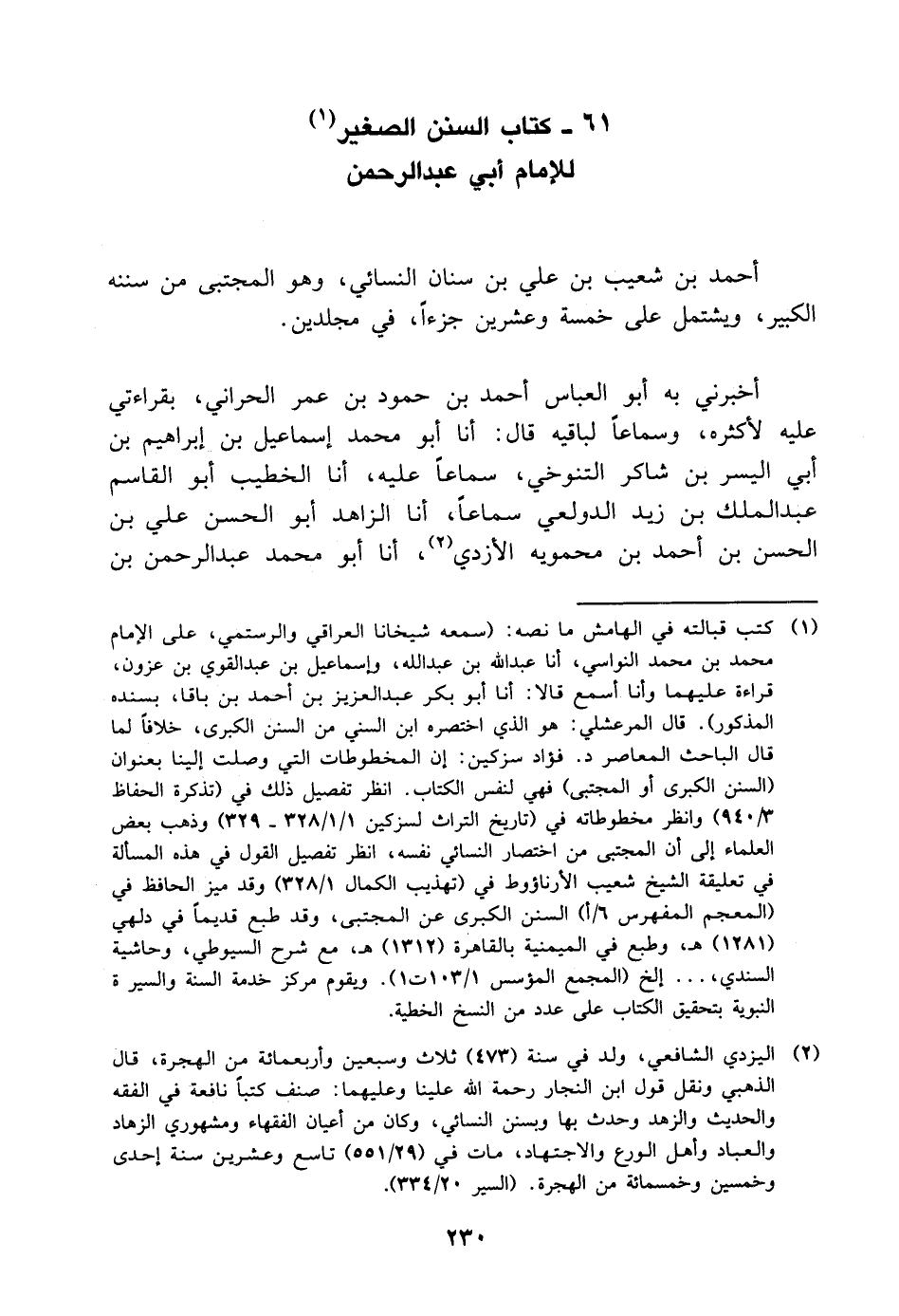 أحمد بْن شعيب بْن علي بْن سنان النسائي، وهو المجتبى من سننه الكبير، ويشتمل على خمسة وعشرين جزءا، في مجلدين أخبرني به أَبُو العباس أَحْمَد بْن حمود بْن عمر الحراني، بِقِرَاءَتِي عليه لأكثره، وسماعا لباقيه قال: أنا أَبُو محمد إسماعيل بْن إبراهيم بْن أَبِي اليسر بْن شاكر التنوخي، سماعا عليه، أنا الخطيب أَبُو الْقَاسِم عَبْد الملك بْن زيد الدولعي سماعا، أنا الزاهد أَبُو الحسن علي بْن الحسن بْن أَحْمَد بْن محمويه الأزدي، أنا أَبُو محمد عَبْد الرحمن بْن
