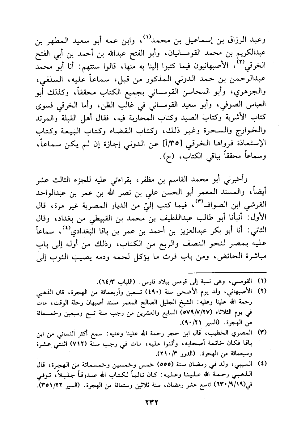 وعبد الرزاق بْن إسماعيل بْن مُحَمَّد، وابن عمه أَبُو سعيد المطهر بْن عَبْد الكريم بْن مُحَمَّد القومسانيان، وأبو الفتح عَبْد اللَّه بْن أَحْمَد بْن أَبِي الفتح الخرقي، الأصبهانيون فيما كتبوا إلينا به منها، قالوا ستتهم: أنا أَبُو محمد عَبْد الرحمن بْن حمد الدوني المذكور من قبل، سماعا عليه، السلفي، والجوهري، وأبو المحاسن القومساني بجميع الكتاب محققا، وكذلك أَبُو العباس الصوفي، وأبو سعيد القومساني في غالب الظن، وأما الخرقي فسوى كتاب الأشربة وكتاب الصيد وكتاب المحاربة فيه، فقال أهل القبلة والمرتد والخوارج والسحرة وغير ذلك، وكتاب القضاء وكتاب البيعة وكتاب الإستعاذة فرواها الخرقي، عن الدوني إجازة إن لم يكن سماعا، وسماعا محققا بباقي الكتاب، ح وأخبرني أَبُو مُحَمَّد الْقَاسِم بْن مظفر، بِقِرَاءَتِي عليه للجزء الثالث عشر أيضا، والمسند المعمر أَبُو الحسن علي بْن نصر اللَّه بْن عمر بْن عَبْد الواحد القرشي بْن الصواف، فيما كتب إلي من الديار المصرية غير مرة، قَالَ الأول: أنبأنا أَبُو طالب عَبْد اللطيف بْن مُحَمَّد بْن القبيطي من بغداد، سماعا عليه بمصر لنحو النصف والربع من الكتاب،
