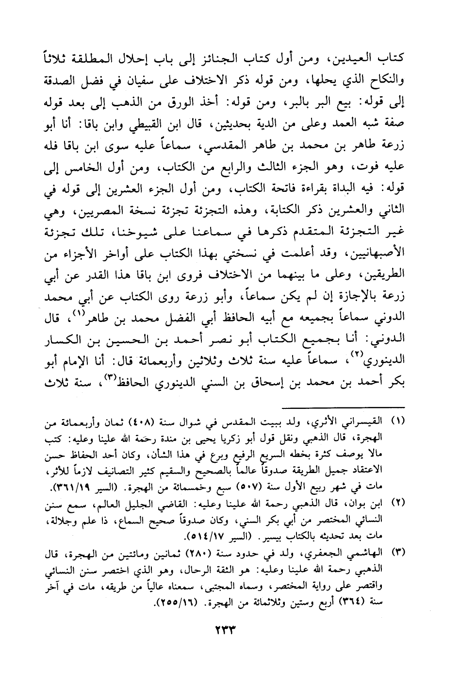 كتاب العيدين، ومن أول كتاب الجنائز إلى باب إحلال المطلقة ثلاثا والنكاح الذي يحلها، ومن قوله ذكر الاختلاف على سفيان في فضل الصدقة إلى قوله: بيع البر بالبر، ومن قوله: أخذ الورق من الذهب إلى بعد قوله صفة شبه العمد وعلى من الدية بحديثين، قَالَ ابن القبيطي وابن باقا: أنا أَبُو زرعة طاهر بْن مُحَمَّد بْن طاهر الْمَقْدِسِيّ، سماعا عليه سوى ابن باقا فله عليه فوت، وهو الجزء الثالث والرابع من الكتاب، ومن أول الخامس إلى قوله: فيه البداة بقراءة فاتحة الكتاب، ومن أول الجزء العشرين إلى قوله في الثاني والعشرين ذكر الكتابة، وهذه التجزئة تجزئة نسخة المصريين، وهي غير التجزئة المتقدم ذكرها في سماعنا على شيوخنا، تلك تجزئة الأصبهانيين، وقد أعلمت في نسختي بهذا الكتاب على أواخر الأجزاء من الطريقين، وعلى ما بينهما من الاختلاف فروى ابن باقا هذا القدر عن أَبِي زرعة بالإجازة إن لم يكن سماعا، وأبو زرعة روى الكتاب عن أَبِي مُحَمَّد الدوني سماعا بجميعه مع أبيه الحافظ أَبِي الفضل مُحَمَّد بْن طاهر، قَالَ الدوني: أنا بجميع الكتاب أنا نصر أَحْمَد بْن الحسين بْن الكسار الدينوي، سماعا عليه سنة ثلاث وثلاثين وأربع مائة قَالَ: أنا الإمام