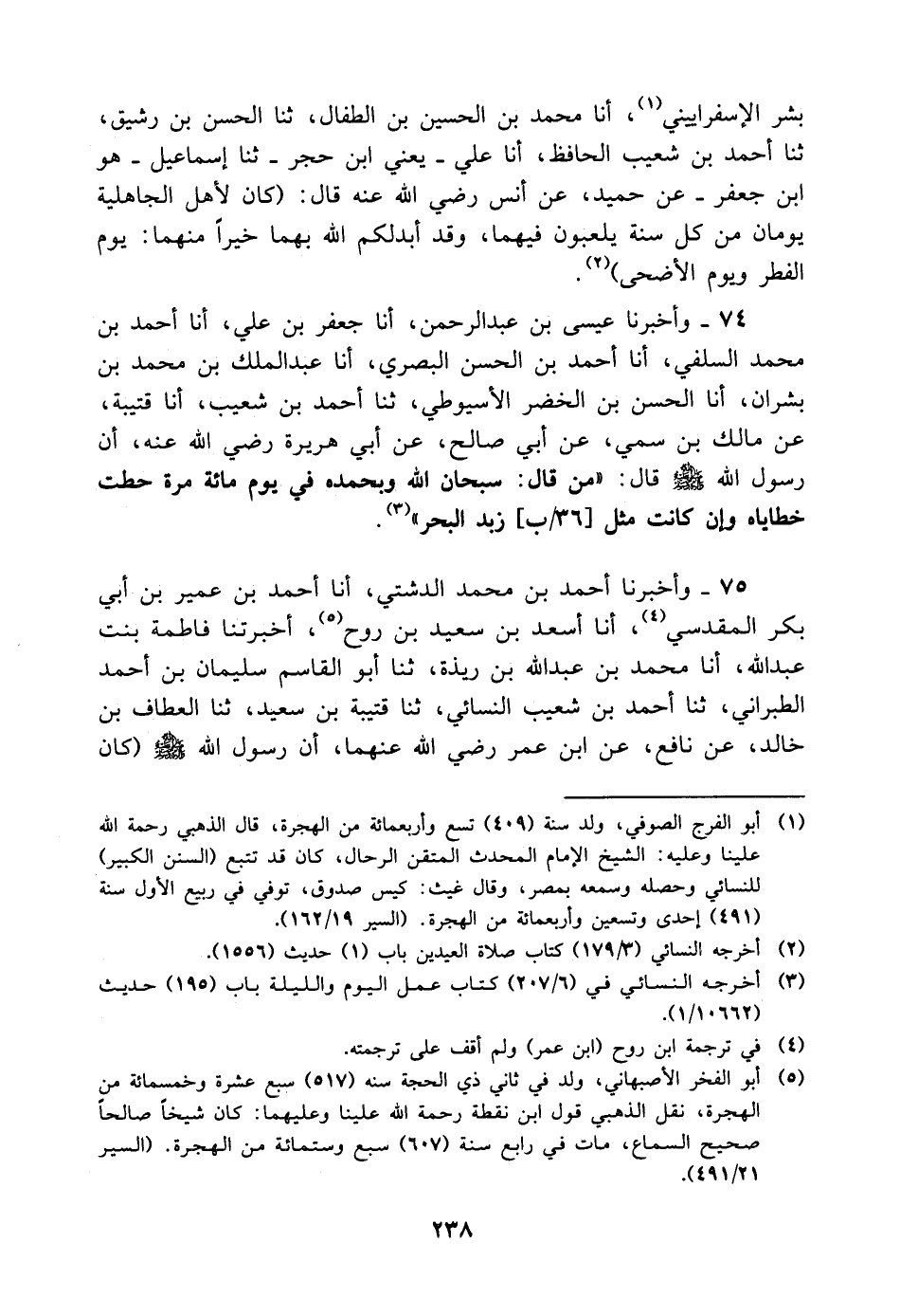74 - وَأَخْبَرَنَا عِيسَى بْنُ عَبْدِ الرَّحْمَنِ، أنا جَعْفَرُ بْنُ عَلِيٍّ، أنا أَحْمَدُ بْنُ مُحَمَّدٍ السِّلَفِيُّ، أنا أَحْمَدُ بْنُ الْحَسَنِ الْبَصْرِيُّ، أنا عَبْدُ الْمَلِكِ بْنُ مُحَمَّدِ بْنِ بِشْرَانَ، أنا الْحَسَنُ بْنُ الْخَضِرِ الأَسْيُوطِيُّ، ثنا أَحْمَدُ بْنُ شُعَيْبٍ، أنا قُتَيْبَةُ، عَنْ مَالِكِ بْنِ سُمَيٍّ، عَنْ أَبِي صَالِحٍ، عَنْ أَبِي هُرَيْرَةَ رَضِيَ اللَّهُ عَنْهُ، أَنَّ رَسُولَ اللَّهِ صَلَّى اللَّهُ عَلَيْهِ وَسَلَّمَ قَالَ: " مَنْ قَالَ: سُبْحَانَ اللَّهِ وَبِحَمْدِهِ فِي يَوْمٍ مِائَةَ مَرَّةٍ حُطَّتْ خَطَايَاهُ وَإِنْ كَانَتْ مِثْلَ زَبَدِ الْبَحْرِ "