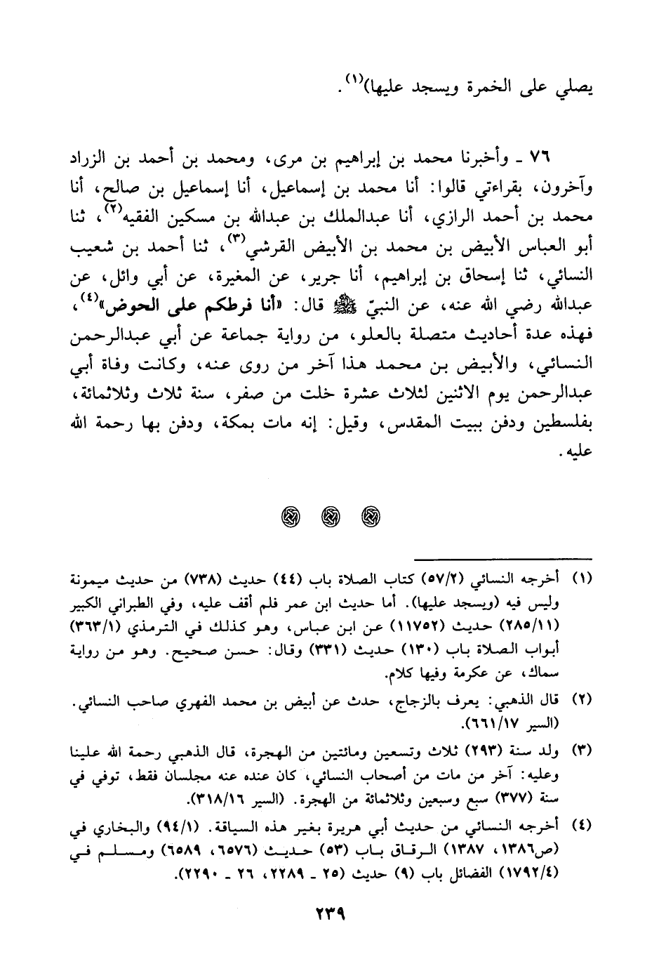 76 - وَأَخْبَرَنَا مُحَمَّدُ بْنُ إِبْرَاهِيمَ بْنِ مُرِّيٍّ، وَمُحَمَّدُ بْنُ أَحْمَدَ بْنِ الزَّرَّادِ وَآخَرُونَ، بِقِرَاءَتِي قَالُوا: أنا مُحَمَّدُ بْنُ إِسْمَاعِيلَ، أنا إِسْمَاعِيلُ بْنُ صَالِحٍ، أنا مُحَمَّدُ بْنُ أَحْمَدَ الرَّازِيُّ، أنا عَبْدُ الْمَلِكِ بْنُ عَبْدِ اللَّهِ بْنِ مِسْكِينٍ الْفَقِيهُ، ثنا أَبُو الْعَبَّاسِ الأَبْيَضُ بْنُ مُحَمَّدِ بْنِ الأَبْيَضِ الْقُرَشِيُّ، ثنا أَحْمَدُ بْنُ شُعَيْبٍ النَّسَائِيُّ، ثنا إِسْحَاقُ بْنُ إِبْرَاهِيمَ، أنا جَرِيرٌ، عَنِ الْمُغِيرَةِ، عَنْ أَبِي وَائِلٍ، عَنْ عَبْدِ اللَّهِ رَضِيَ اللَّهُ عَنْهُ، عَنِ النَّبِيِّ صَلَّى اللَّهُ عَلَيْهِ وَسَلَّمَ قَالَ: " أنا فَرَطُكُمْ عَلَى الْحَوْضِ "، فَهَذِهِ عِدَّةُ أَحَادِيثَ مُتَّصِلَةٌ بِالْعُلُوِّ، مِنْ رِوَايَةِ جَمَاعَةٍ عَنْ أَبِي عَبْدِ الرَّحْمَنِ النَّسَائِيِّ، وَالأَبْيَضِ بْنِ مُحَمَّدٍ هَذَا آخِرُ مَنْ رَوَى عَنْهُ وكانت وفاة أَبِي عَبْد الرحمن يوم الاثنين لثلاث عشرة خلت من صفر، سنة ثلاث وثلاث مائة، بفلسطين ودفن ببيت المقدس، وقيل: إنه مات بمكة، ودفن بها رحمة اللَّه عليه