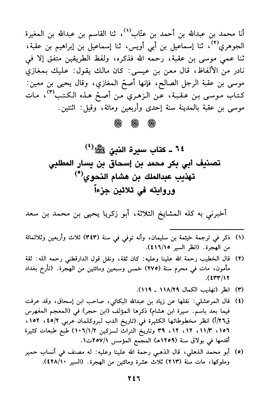 أنا محمد بْن عَبْد اللَّه بْن أَحْمَد بْن عتاب، ثنا الْقَاسِم بْن عَبْد اللَّه بْن المغيرة الجوهري، ثنا إسماعيل بْن أَبِي أويس، ثنا إسماعيل بْن إبراهيم بْن عقبة، ثنا عمي موسى بْن عقبة، رحمه اللَّه فذكره، ولفظ الطريقين متفق إلا في نادر من الألفاظ، قَالَ معن بْن عيسى: كان مالك يقول: عليك بمغازي موسى بْن عقبة الرجل الصالح، فإنها أصح المغازي، وقال يحيى بْن معين: كتاب موسى بْن عقبة، عن الزهري من أصح هذه الكتب، مات موسى بْن عقبة بالمدينة سنة إحدى وأربعين ومائة، وقيل اثنتين