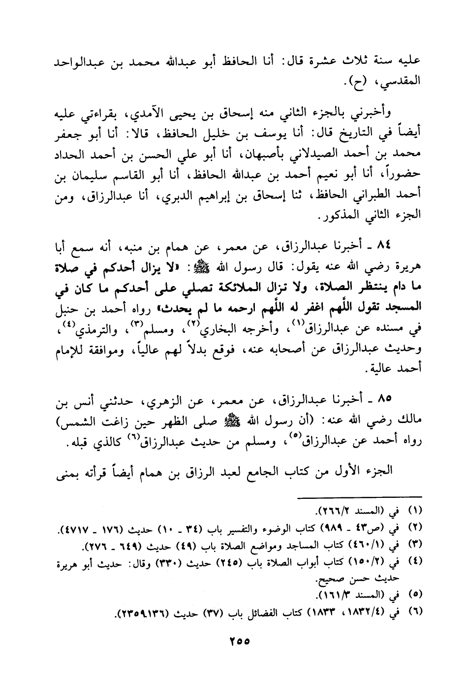 عليه سنة ثلاث عشرة قَالَ: أنا الحافظ أَبُو عَبْد اللَّه مُحَمَّد بْن عَبْد الواحد الْمَقْدِسِيّ، ح وأخبرني بالجزء الثاني منه إسحاق بْن يحيى الآمدي، بِقِرَاءَتِي عليه أيضا في التاريخ قَالَ: أنا يوسف بْن خليل الحافظ، قالا: أنا أَبُو جعفر مُحَمَّد بْن أَحْمَد الصيدلاني بأصبهان، أنا أَبُو علي الحسن بْن أَحْمَد الحداد حضورا، أنا أَبُو نعيم أَحْمَد بْن عَبْد اللَّه الحافظ، أنا أَبُو الْقَاسِم سليمان بْن أَحْمَد الطبراني الحافظ، ثنا إسحاق بْن إبراهيم الدبري، أنا عَبْد الرزاق، ومن الجزء الثاني المذكور
