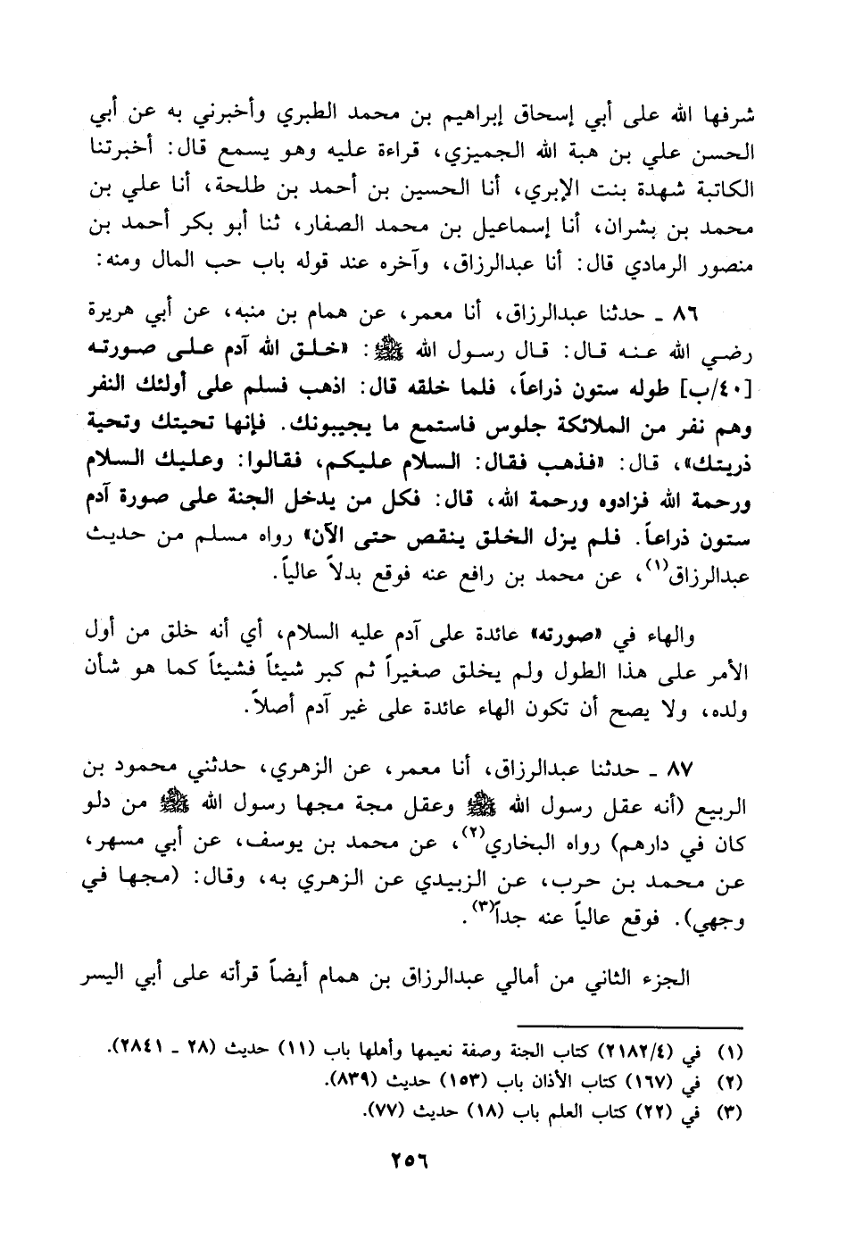 85 - حَدَّثَنَا عَبْدُ الرَّزَّاقِ، أنا مَعْمَرٌ، عَنْ هَمَّامِ بْنِ مُنَبِّهٍ، عَنْ أَبِي هُرَيْرَةَ رَضِيَ اللَّهُ عَنْهُ قَالَ: قَالَ رَسُولُ اللَّهِ صَلَّى اللَّهُ عَلَيْهِ وَسَلَّمَ: " خَلَقَ اللَّهُ آدَمَ عَلَى صُورَتِهِ طُولُهُ سِتُّونَ ذِرَاعًا، فَلَمَّا خَلَقَهُ قَالَ: اذْهَبْ فَسَلِّمْ عَلَى أُولَئِكَ النَّفَرِ وَهُمْ نَفَرٌ مِنَ الْمَلائِكَةِ جُلُوسٌ فَاسْتَمِعْ مَا يُجِيبُونَكَ فَإِنَّهَا تَحِيَّتُكَ وَتَحِيَّةُ ذُرِّيَّتِكَ "، وَقَالَ: " فَذَهَبَ فَقَالَ: السَّلامُ عَلَيْكُمْ، فَقَالُوا: وَعَلَيْكَ السَّلامُ وَرَحْمَةُ اللَّهِ فَزَادُوهُ وَرَحْمَةُ اللَّهِ، قَالَ: فَكُلُّ مَنْ يَدْخُلُ الْجَنَّةَ عَلَى صُورَةِ آدَمَ سِتُّونَ ذِرَاعًا فَلَمْ يَزَلِ الْخَلْقُ يَنْقُصُ حَتَّى الآنَ " رَوَاهُ مُسْلِمٌ مِنْ 86 -حَدِيثِ عَبْدِ الرَّزَّاقِ، عَنْ مُحَمَّدِ بْنِ رَافِعٍ عَنْهُ فَوَقَعَ بَدَلا عَالِيًا وَالْهَاءُ فِي " صُورَتِهِ " عَائِدَةٌ عَلَى آدَمَ عَلَيْهِ السَّلامُ، أَيْ أَنَّهُ خُلِقَ مِنْ أَوَّلِ الأَمْرِ عَلَى هَذَا الطُّولِ وَلَمْ يُخْلَقْ صَغِيرًا ثُمَّ كَبُرَ شَيْئًا فَشَيْئًا كَمَا هُوَ شَأْنُ وَلَدِهِ، وَلا يَصِحُّ أَنْ تَكُونَ الْهَاءُ عَائِدَةً عَلَى غَيْرِ آدَمَ أَصْلا