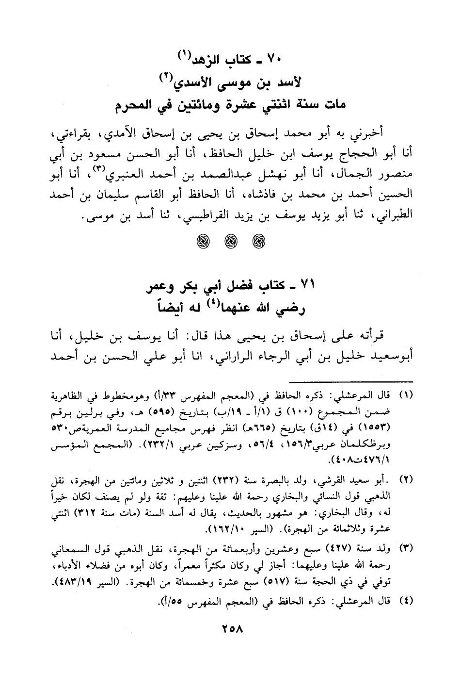 قرأته على إسحاق بْن يحيى هذا قَالَ: أنا يوسف بْن خليل، أنا أَبُو سعيد خليل بْن أَبِي الرجاء الراراني، أنا أَبُو علي الحسن بْن أَحْمَد