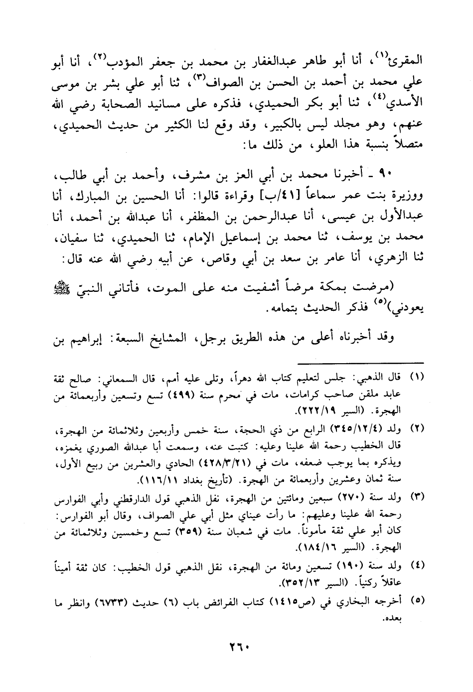 المقرئ، أنا أَبُو طاهر عَبْد الغفار بْن مُحَمَّد بْن جعفر المؤدب، أنا أَبُو علي مُحَمَّد بْن أَحْمَد بْن الحسن بْن الصواف، ثنا أَبُو علي بشر بْن موسى الأسدي، ثنا أَبُو بكر الحميدي، فذكره على مسانيد الصحابة رضي اللَّه عنهم، وهو مجلد ليس بالكبير، وقد وقع لنا الكثير من حديث الحميدي متصلا بنسبة هذا العلو، من ذلك ما:
