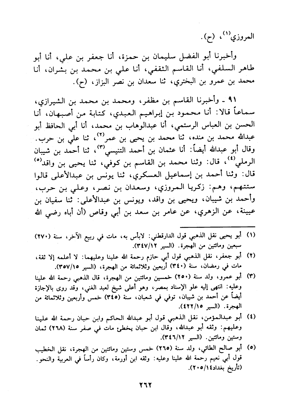 91 - وَأَخْبَرَنَا الْقَاسِمُ بْنُ مُظَفَّرٍ، وَمُحَمَّدُ بْنُ مُحَمَّدِ بْنِ الشِّيرَازِيِّ، سَمَاعًا قَالا: أنا مَحْمُودُ بْنُ إِبْرَاهِيمَ الْعَبْدِيُّ، كِتَابَةً مِنْ أَصْبَهَانَ، أنا الْحَسَنُ بْنُ الْعَبَّاسِ الرُّسْتُمِيُّ، أنا عَبْدُ الْوَهَّابِ بْنُ مُحَمَّدٍ، أنا أَبِي الْحَافِظُ أَبُو عَبْدِ اللَّهِ مُحَمَّدُ بْنُ مَنْدَهْ، ثنا مُحَمَّدُ بْنُ يَحْيَى بْنِ عُمَرَ، ثنا عَلِيُّ بْنُ حَرْبٍ وَقَالَ أَبُو عَبْدِ اللَّهِ أَيْضًا: أنا عُثْمَانُ بْنُ أَحْمَدَ التِّنِّيسِيُّ، ثنا أَحْمَدُ بْنُ شَيْبَانَ الرَّمْلِيُّ، قَالَ: وَثنا مُحَمَّدُ بْنُ الْقَاسِمِ بْنِ كُوفِيٍّ، ثنا يَحْيَى بْنُ وَاقِدٍ، قَالَ: وَثنا أَحْمَدُ بْنُ إِسْمَاعِيلَ الْعَسْكَرِيُّ، ثنا يُونُسُ بْنُ عَبْدِ الأَعْلَى، قَالُوا سِتَّتُهُمْ، وَهُمْ: زَكَرِيَّا الْمَرْوَزِيُّ، وَسَعْدَانُ بْنُ نَصْرٍ، وَعَلِيُّ بْنُ حَرْبٍ، وَأَحْمَدُ بْنُ شَيْبَانَ، وَيَحْيَى بْنُ وَاقِدٍ، وَيُونُسُ بْنُ عَبْدِ الأَعْلَى: ثنا سُفْيَانُ بْنُ عُيَيْنَةَ، عَنِ الزُّهْرِيِّ، عَنْ عَامِرِ بْنِ سَعْدِ بْنِ أَبِي وَقَّاصٍ، أَنَّ أَبَاهُ رَضِيَ اللَّهُ