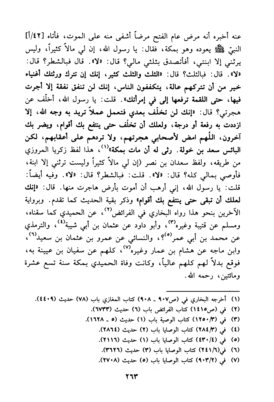 قُلْتُ: يَا رَسُولَ اللَّهِ، أُخَلَّفُ عَنْ هِجْرَتِي؟ قَالَ: " إِنَّكَ لَنْ تُخَلَّفَ بَعْدِي فَتَعْمَلَ عَمَلا تُرِيدُ بِهِ وَجْهَ اللَّهِ، إِلا ازْدَدْتَ بِهِ رِفْعَةً أَوْ دَرَجَةً، وَلَعَلَّكَ أَنْ تُخَلَّفَ حَتَّى يَنْتَفِعَ بِكَ أَقْوَامٌ، وَيُضَرَّ بِكَ آخَرُونَ، اللَّهُمَّ امْضِ لأَصْحَابِي هِجْرَتَهُمْ، وَلا تَرُدَّهُمْ عَلَى أَعْقَابِهِمْ، لَكِنِ الْبَائِسُ سَعْدُ بْنُ خَوْلَةَ رَثَى لَهُ أَنْ مَاتَ بِمَكَّةَ "، هَذَا لَفْظُ زَكَرِيَّا الْمَرْوَزِيِّ مِنْ طَرِيقِهِ، وَلَفْظُ سَعْدَانَ بْنِ نَصْرٍ إِنَّ لِي مَالا كَثِيرًا وَلَيْسَتْ تَرِثُنِي إِلا ابْنَةٌ، فَأُوصِي بِمَالِي كُلِّهِ؟ قَالَ: " لا " قُلْتُ: فَبِالشَّطْرِ؟ قَالَ: " لا " وَفِيهِ أَيْضًا: قُلْتُ: يَا رَسُولَ اللَّهِ، إِنِّي أَرْهَبُ أَنْ أَمُوتَ بِأَرْضٍ هَاجَرْتُ مِنْهَا قَالَ: " إِنَّكَ لَعَلَّكَ أَنْ تَبْقَى حَتَّى يَنْتَفِعَ بِكَ أَقْوَامٌ " وَذَكَرَ بَقِيَّةَ الْحَدِيثِ كَمَا تَقَدَّمَ وَبِرِوَايَةِ الآخَرِينَ بِنَحْوِ هَذَا رَوَاهُ الْبُخَارِيُّ فِي الْفَرَائِضِ، عَنِ الْحُمَيْدِيِّ كَمَا سُقْنَاهُ، وَمُسْلِمٌ، عَنْ قُتَيْبَةَ وَغَيْرِهِ، وَأَبُو دَاوُدَ، عَنْ عُثْمَانَ بْنِ أَبِي شَيْبَةَ، وَالتِّرْمِذِيُّ، عَنْ مُحَمَّدِ بْنِ أَبِي عُمَرَ، وَالنَّسَائِيُّ، عَنْ عَمْرِو بْنِ عُثْمَانَ بْنِ سَعِيدٍ، وَابْنُ مَاجَهْ، عَنْ هِشَامِ بْنِ عَمَّارٍ وَغَيْرِهِ، كُلُّهُمْ عَنْ سُفْيَانَ بْنِ عُيَيْنَةَ بِهِ، فَوَقَعَ بَدَلا لَهُمْ كُلِّهِمْ عَالِيًا وكانت وفاة الحميدي بمكة سنة تسع عشرة ومائتين، رحمه اللَّه