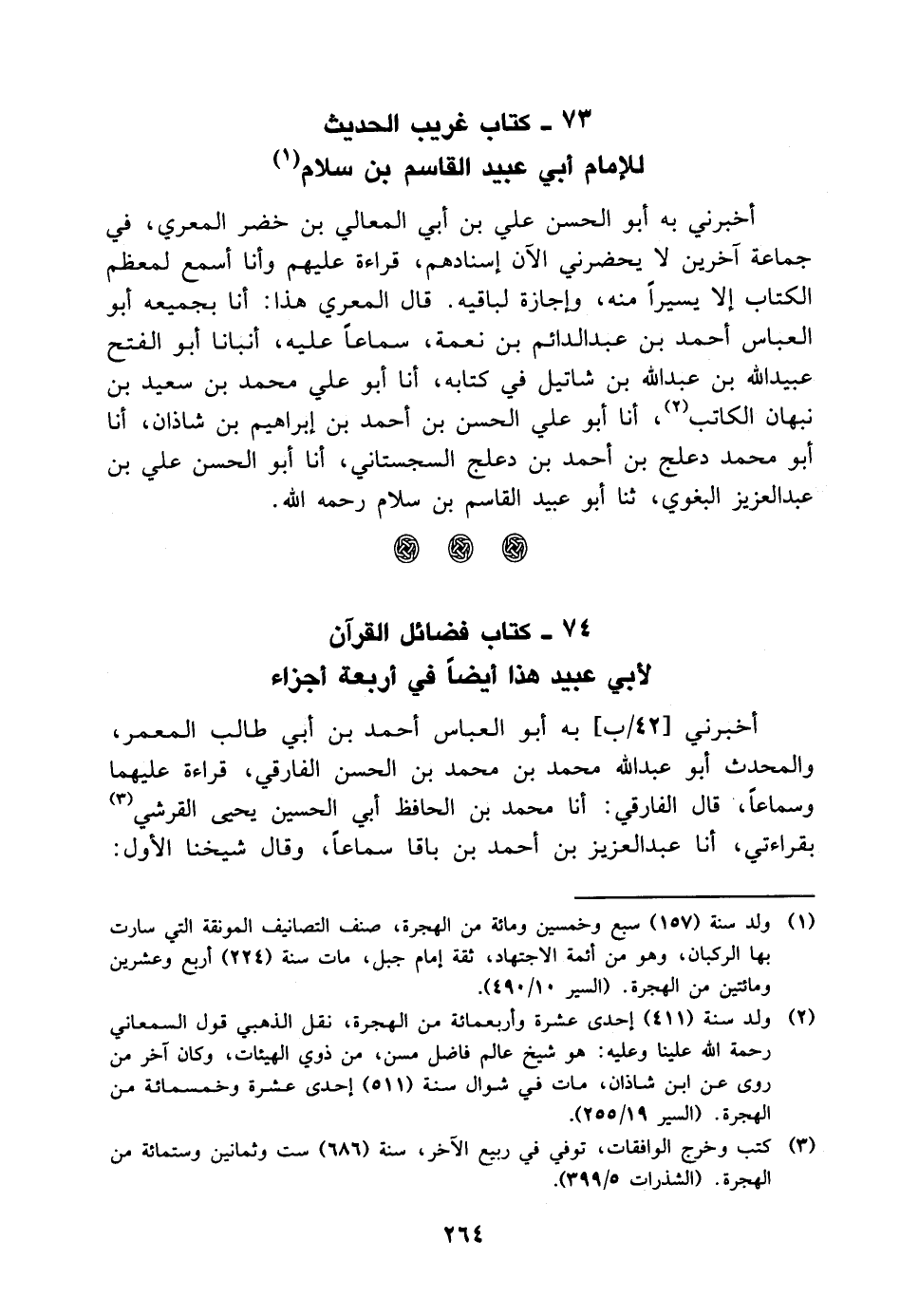 أخبرني به أَبُو الحسن علي بْن أَبِي المعالي بْن خضر المعري، في جماعة آخرين لا يحضرني الآن إسنادهم، قراءة عليهم وأنا أسمع لمعظم الكتاب إلا يسيرا منه، وإجازة لباقيه قَالَ المعري هذا: أنا بجميعه أَبُو العباس أَحْمَد بْن عَبْد الدائم بْن نعمة، سماعا عليه، أنبأنا أَبُو الفتح عبيد اللَّه بْن عَبْد اللَّه بْن شاتيل في كتابه، أنا أَبُو علي مُحَمَّد بْن سعيد بْن نبهان الكاتب، أنا أَبُو علي الحسن بْن أَحْمَد بْن إبراهيم بْن شاذان، أنا أَبُو محمد دعلج بْن أَحْمَد بْن دعلج السجستاني، أنا أَبُو الحسن علي بْن عَبْد العزيز البغوي، ثنا أَبُو عبيد الْقَاسِم بْن سلام رحمه اللَّه