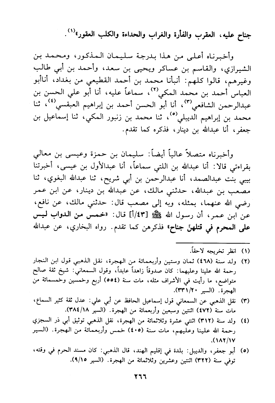 جُنَاحَ عَلَيْهِ، الْعَقْرَبُ وَالْفَأْرَةُ وَالْغُرَابُ وَالْحِدَّأَةُ وَالْكَلْبُ الْعَقُورُ " وَأَخْبَرَنَاهُ أَعْلَى مِنْ هَذَا بِدَرَجَةٍ سُلَيْمَانُ الْمَذْكُورُ، وَمُحَمَّدُ بْنُ الشِّيرَازِيِّ، وَالْقَاسِمُ بْنُ عَسَاكِرَ، وَيَحْيَى بْنُ سَعْدٍ، وَأَحْمَدُ بْنُ أَبِي طَالِبٍ وَغَيْرُهُمْ، قَالُوا كُلُّهُمْ: أَنْبَأَنَا مُحَمَّدُ بْنُ أَحْمَدَ الْقَطِيعِيُّ مِنْ بَغْدَادَ، أنا أَبُو الْعَبَّاسِ أَحْمَدُ بْنُ مُحَمَّدٍ الْمَكِّيُّ، سَمَاعًا عَلَيْهِ، أنا أَبُو عَلِيٍّ الْحَسَنُ بْنُ عَبْدِ الرَّحْمَنِ الشَّافِعِيُّ، أنا أَبُو الْحَسَنِ أَحْمَدُ بْنُ إِبْرَاهِيمَ الْعَبْقَسِيُّ، ثنا مُحَمَّدُ بْنُ إِبْرَاهِيمَ الدَّيْبُلِيُّ، ثنا مُحَمَّدُ بْنُ زُنْبُورٍ الْمَكِّيُّ، ثنا إِسْمَاعِيلُ بْنُ جَعْفَرٍ، أنا عَبْدُ اللَّهِ بْنُ دِينَارٍ، فَذَكَرَهُ كَمَا تَقَدَّمَ وَأَخْبَرَنَاهُ مُتَّصِلا عَالِيًا أَيْضًا: سُلَيْمَانُ بْنُ حَمْزَةَ، وَعِيسَى بْنُ مَعَالِي بِقِرَاءَتِي قَالا: أنا عَبْدُ اللَّهِ بْنُ اللَّتِّيِّ سَمَاعًا، أنا عَبْدُ الأَوَّلِ بْنُ عِيسَى، أَخْبَرَتْنَا بِيبِي بِنْتُ عَبْدِ الصَّمَدِ، أنا عَبْدُ الرَّحْمَنِ بْنُ أَبِي شُرَيْحٍ، ثنا عَبْدُ اللَّهِ الْبَغَوِيُّ، ثنا مُصْعَبُ بْنُ عَبْدِ اللَّهِ، حَدَّثَنِي مَالِكٌ، عَنْ عَبْدِ اللَّهِ بْنِ دِينَارٍ، عَنِ ابْنِ عُمَرَ رَضِيَ اللَّهُ عَنْهُمَا، بِمِثْلِهِ