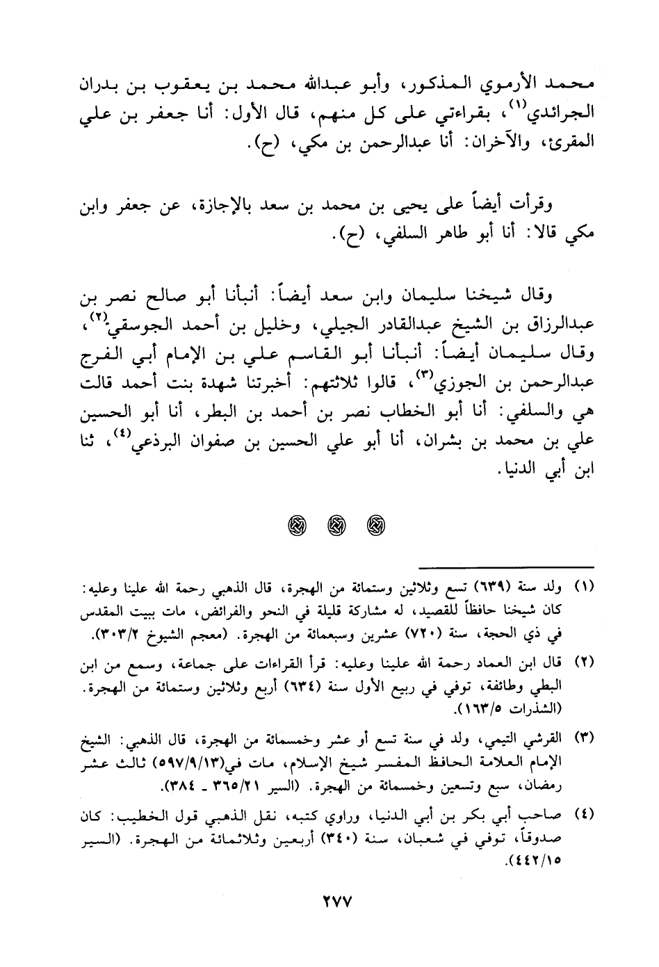 مُحَمَّد الأموي المذكور، وأبو عَبْد اللَّه مُحَمَّد بْن يعقوب بْن بدران الجرائدي، بِقِرَاءَتِي على كل منهم، قَالَ الأول: أنا جعفر بْن علي المقرئ، والآخران: أنا عَبْد الرحمن بْن مكي، ح وقرأت أيضا على يحيى بْن مُحَمَّد بْن سعد بالإجازة، عن جعفر وابن مكي قالا: أنا أَبُو طاهر السلفي، ح وقال شيخنا سليمان وابن سعد أيضا: أنبأنا أَبُو صالح نصر بْن عَبْد الرزاق بْن الشيخ عَبْد القادر الجيلي، وخليل بْن أَحْمَد الجوسقي، وقال سليمان أيضا: أنبأنا أَبُو الْقَاسِم علي بْن الإمام أَبِي الفرج عَبْد الرحمن بْن الجوزي، قالوا ثلاثتهم: أخبرتنا شهدة بنت أَحْمَد قالت هي والسلفي: أنا أَبُو الخطاب نصر بْن أَحْمَد بْن البطر، أنا أَبُو الحسين علي بْن مُحَمَّد بْن بشران، أنا أَبُو علي الحسين بْن صفوان البرذعي، ثنا ابن أَبِي الدنيا