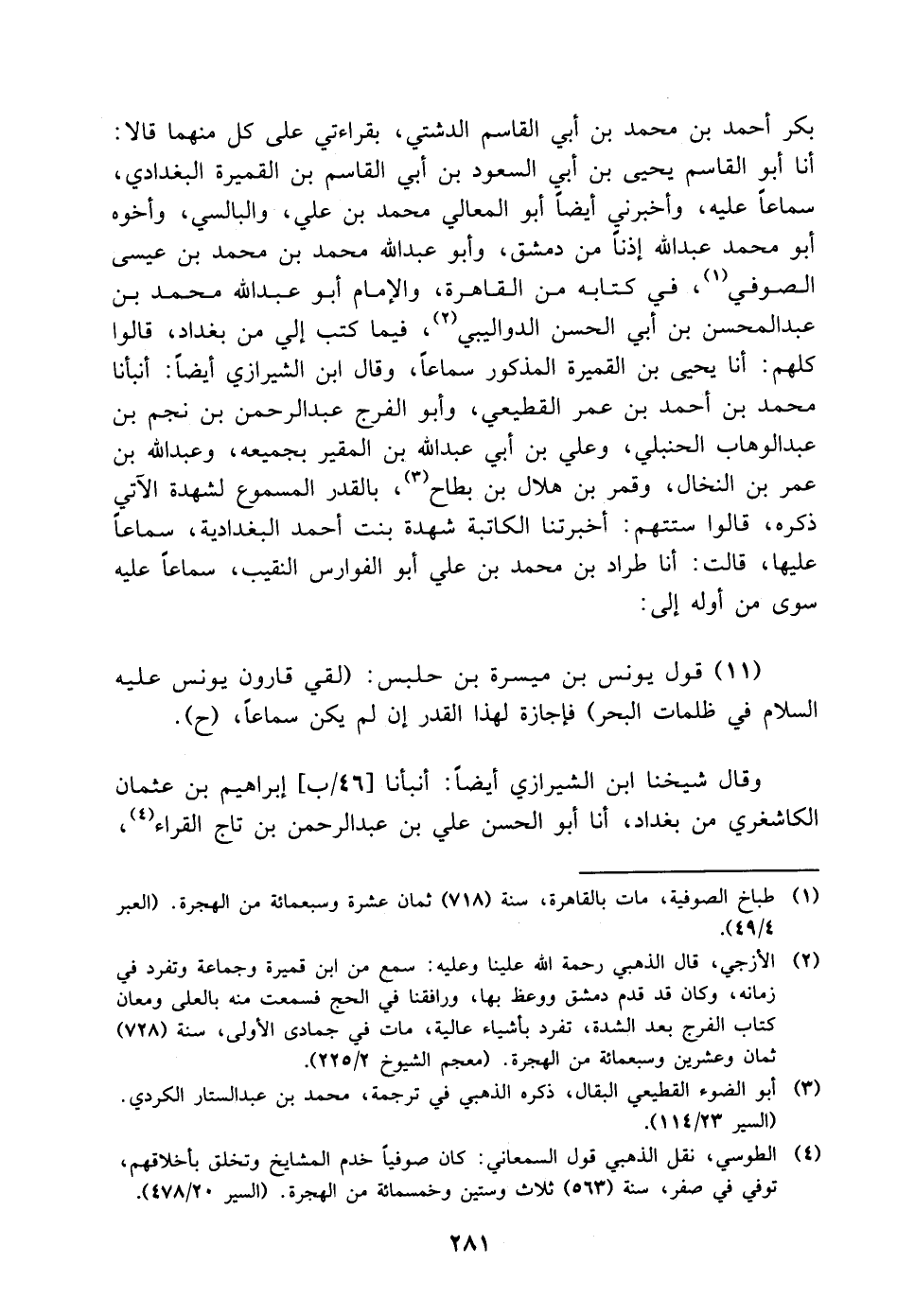 بكر أَحْمَد بْن مُحَمَّد بْن أَبِي الْقَاسِم الدشتي، بِقِرَاءَتِي على كل منهما قالا: أنا أَبُو الْقَاسِم يحيى بْن أَبِي السعود بْن أَبِي الْقَاسِم بْن القميرة البغدادي، سماعا عليه، وأخبرني أيضا أَبُو المعالي مُحَمَّد بْن علي، والبالسي، وأخوه أَبُو مُحَمَّد عَبْد اللَّه إذنا من دمشق، وأبو عَبْد اللَّه مُحَمَّد بْن مُحَمَّد بْن عيسى الصوفي، في كتابه من القاهرة، والإمام أَبُو عَبْد اللَّه مُحَمَّد بْن عَبْد المحسن بْن أَبِي الحسن الدواليبي، فيما كتب إلي من بغداد، قالوا كلهم: أنا يحيى بْن القميرة المذكور سماعا، وقال ابن الشيرازي أيضا: أنبأنا مُحَمَّد بْن أَحْمَد بْن عمر القطيعي، وأبو الفرج عَبْد الرحمن بْن نجم بْن عَبْد الوهاب الحنبلي، وعلي بْن أَبِي عَبْد اللَّه بْن المقير بجميعه، وعبد اللَّه بْن عمر بْن النخال، وقمر بْن هلال بْن بطاح، بالقدر المسموع لشهدة الآتي ذكره، قالوا ستتهم: أخبرتنا الكاتبة شهدة بنت أَحْمَد البغدادية، سماعا عليها، قالت: أنا طراد بْن مُحَمَّد بْن علي أَبُو الفوارس النقيب، سماعا عليه سوى من أوله إلى: قول يونس بْن ميسرة بْن حلبس: لقي قارون يونس عليه السلام في ظلمات البحر فإجازة لهذا القدر إن لم يكن سماعا